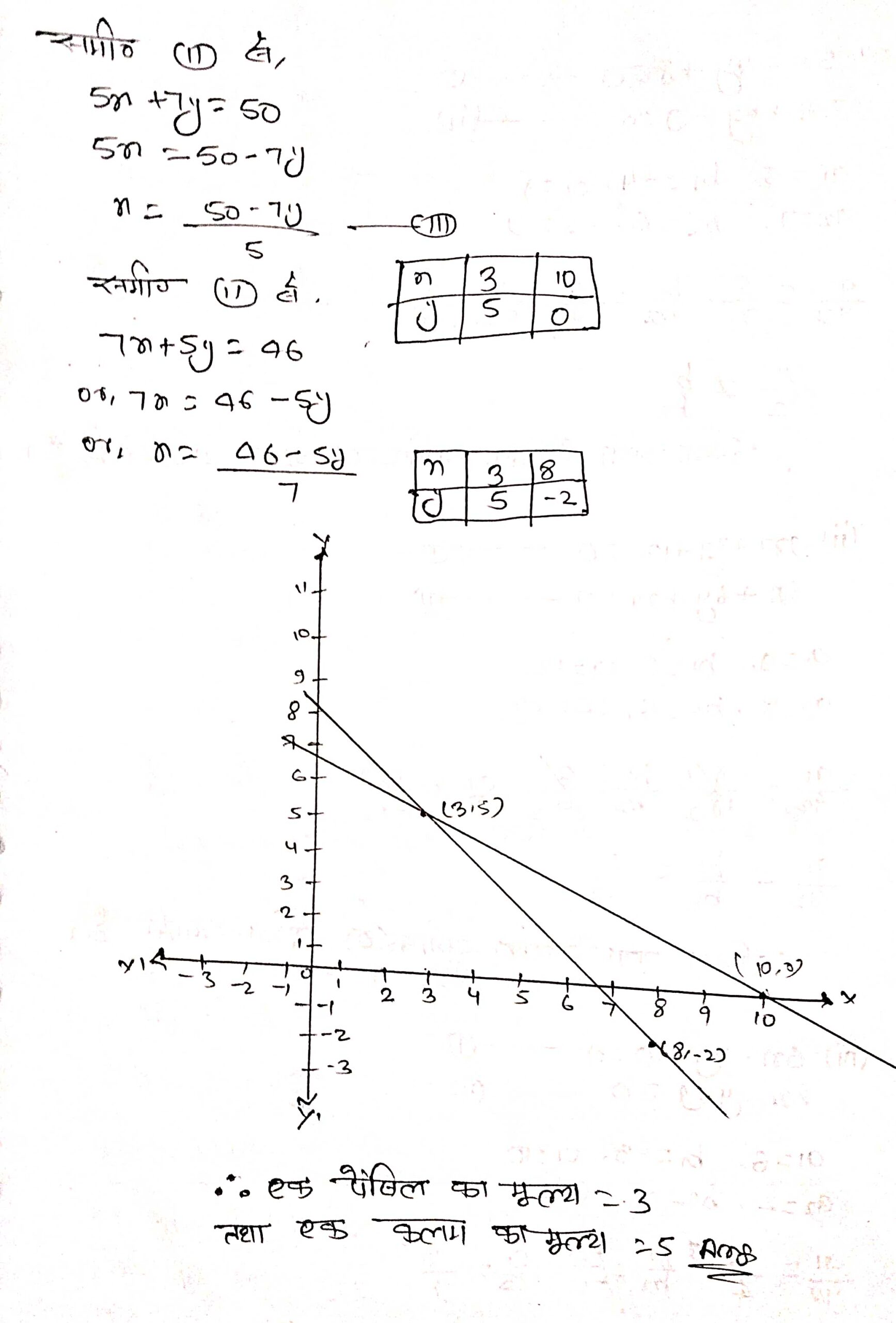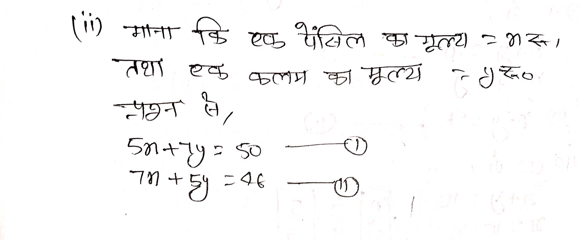 (ii) 5 पेन्सिलों तथा 7 कलमों का कुल मूल्य ₹ 50 है, जबकि 7 पेन्सिलों तथा 5 कलमों का कुल मूल्य ₹ 46 है। एक पेन्सिल का मूल्य तथा एक कलम का मूल्य ज्ञात कीजिए।