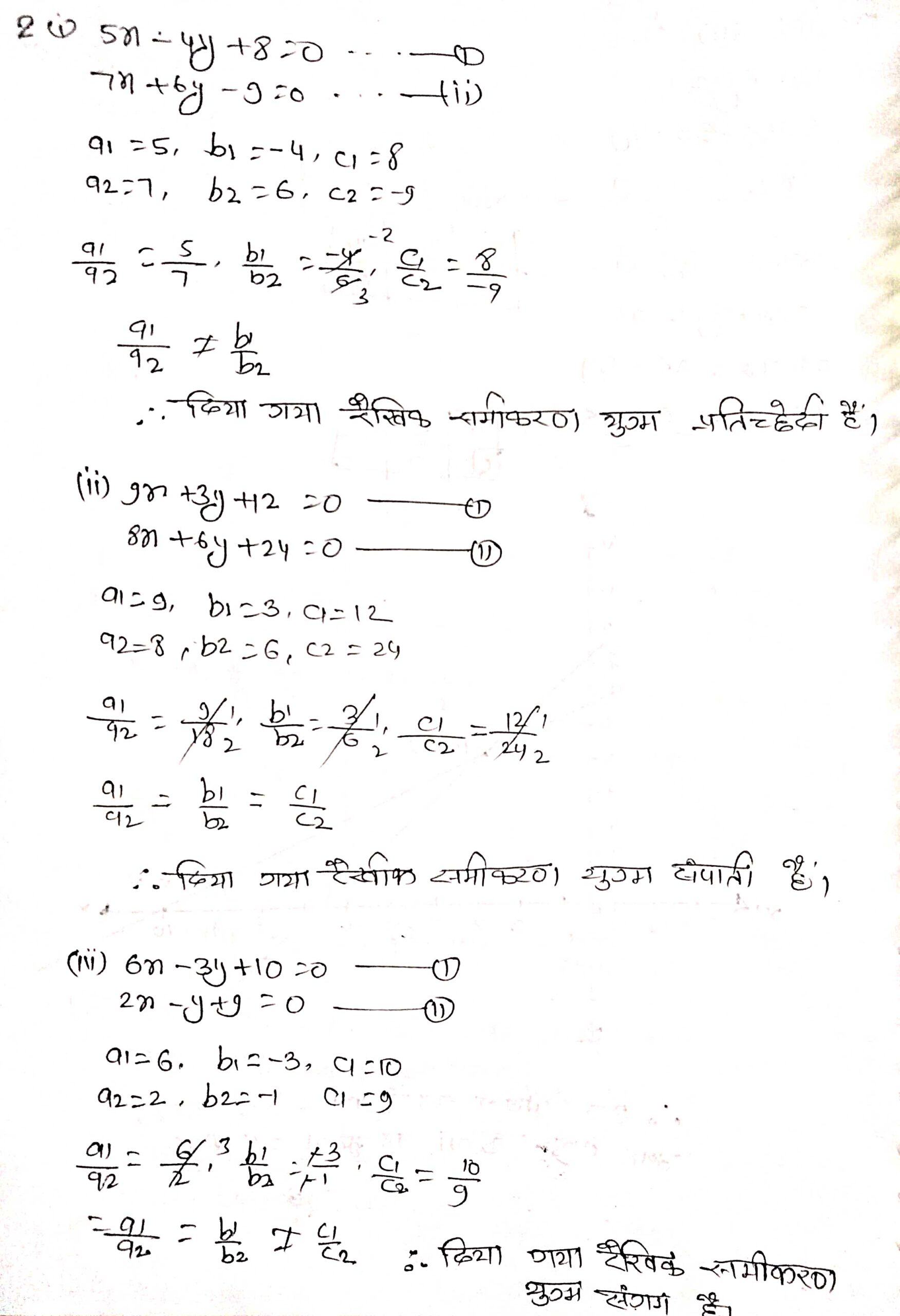 की तुलना कर ज्ञात कीजिए कि निम्न समीकरण युग्म द्वारा निरूपित रेखाएँ एक बिन्दु पर प्रतिच्छेद करती हैं, समान्तर अथवा सम्पाती है।