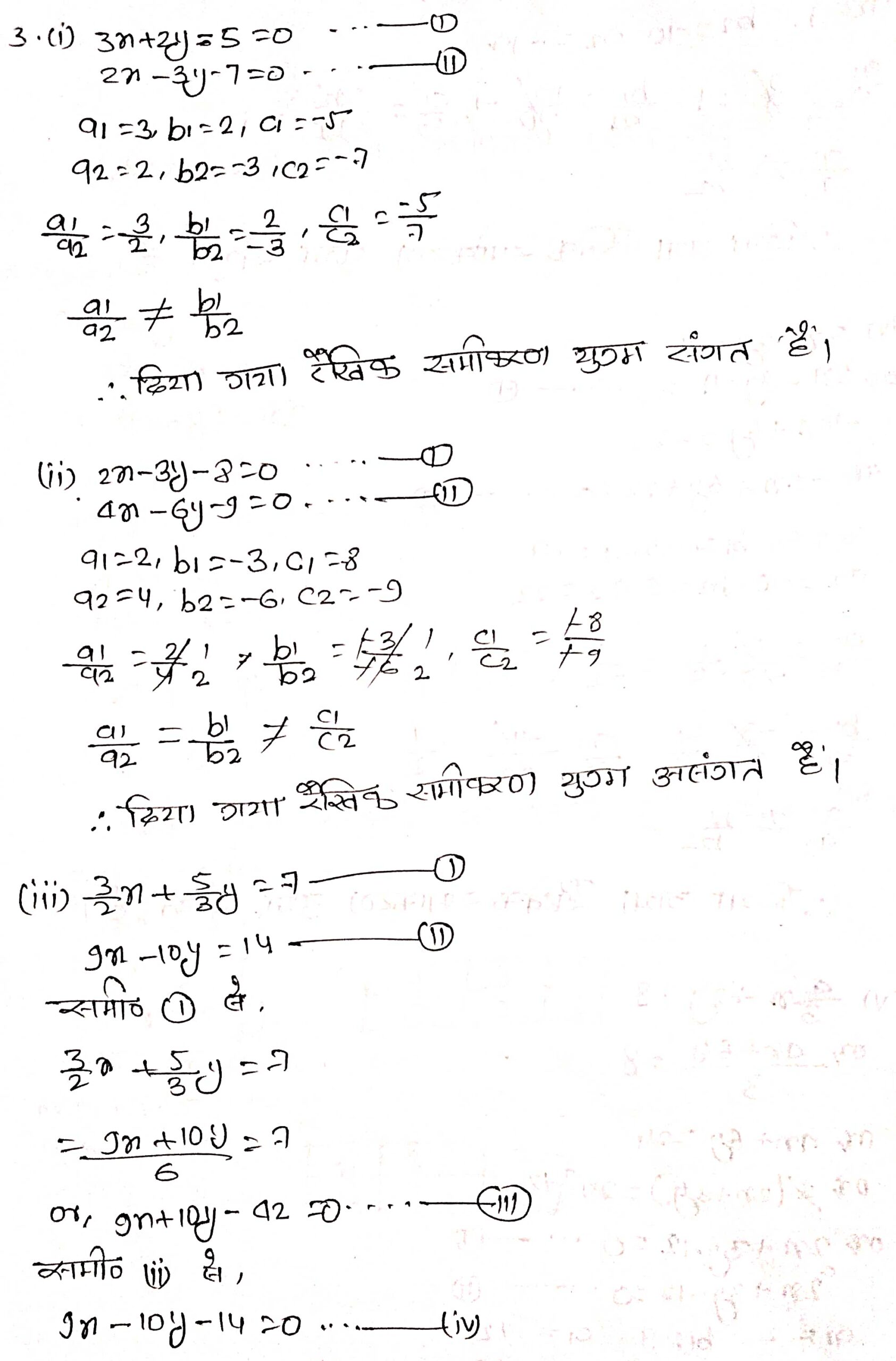 प्रश्न 4. निम्न रैखिक समीकरणों के युग्मों में से कौन-से युग्म संगत/असंगत हैं, यदि संगत हैं तो ग्राफीय विधि से हल ज्ञात कीजिए।