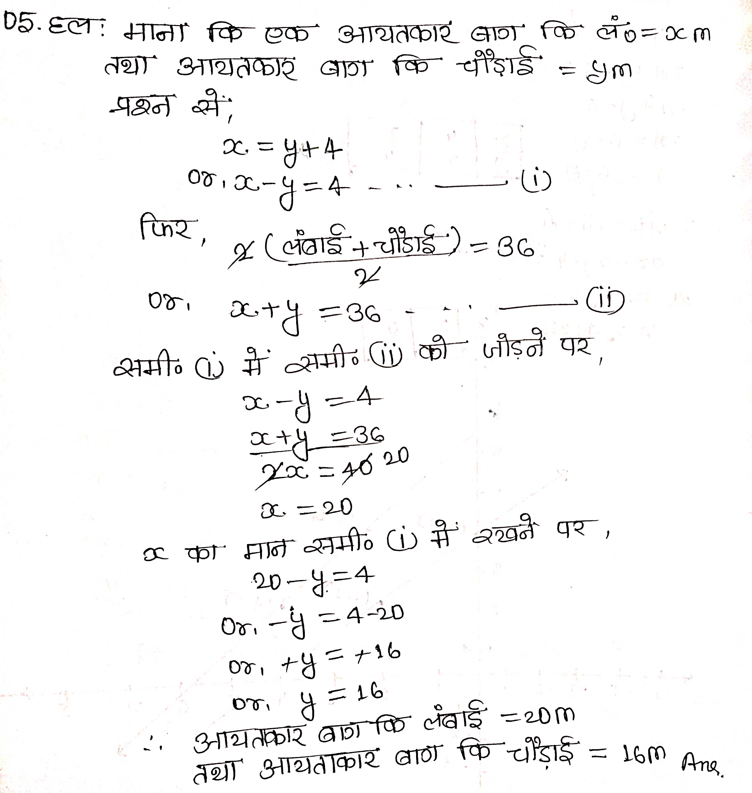 प्रश्न 5. एक आयताकार बाग, जिसकी लम्बाई, चौड़ाई से 4 मीटर अधिक है, का अर्द्धपरिमाप 36 मीटर है। बाग की विमाएँ ज्ञात कीजिए।