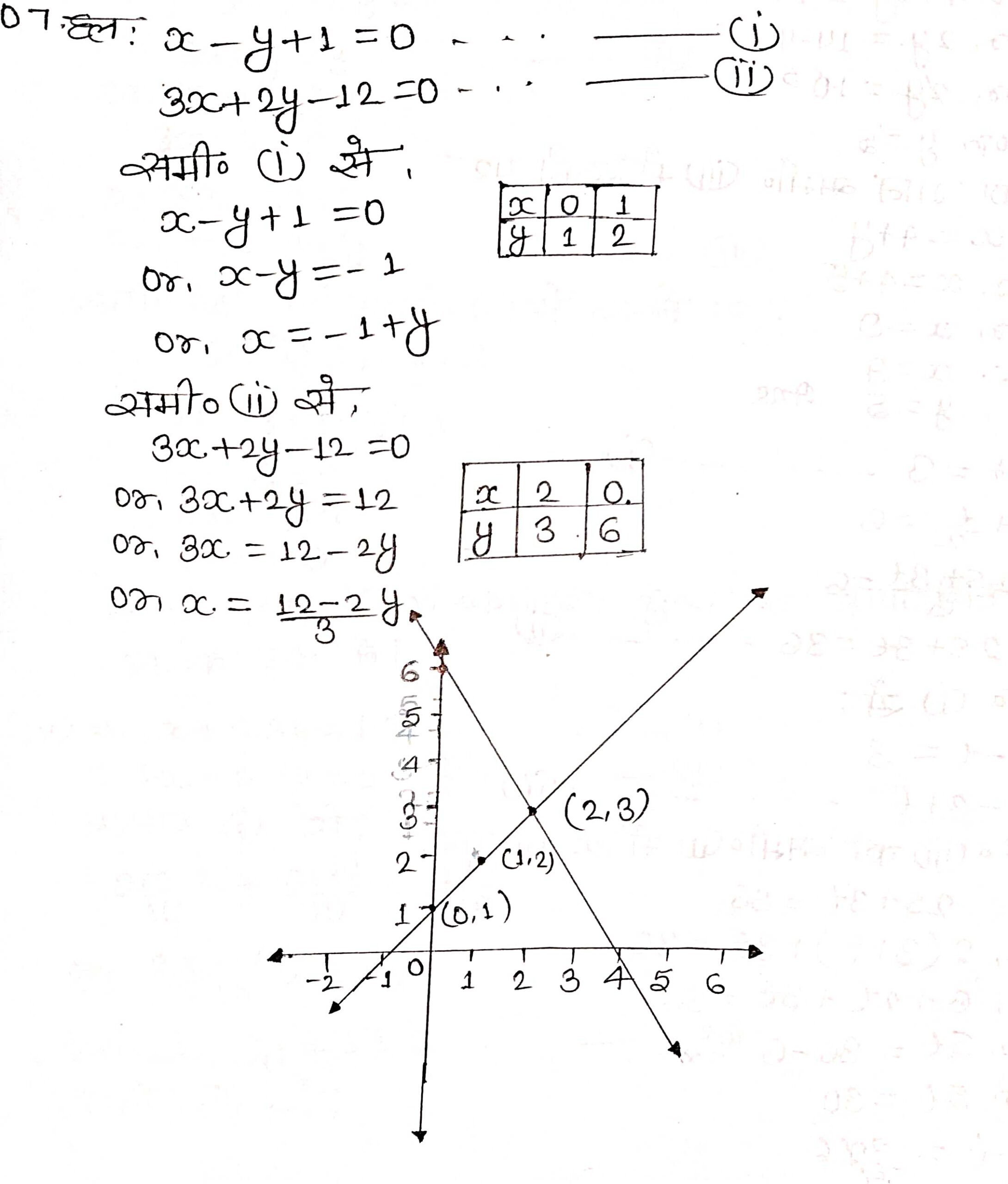 प्रश्न 7. समीकरणों x – y + 1 = 0 और 3x + 2y – 12 = 0 का ग्राफ खींचिए। X-अक्ष और इन रेखाओं से बने त्रिभुज के शीर्षों के निर्देशांक ज्ञात कीजिए और त्रिभुजाकार पटल को छायांकित कीजिए।