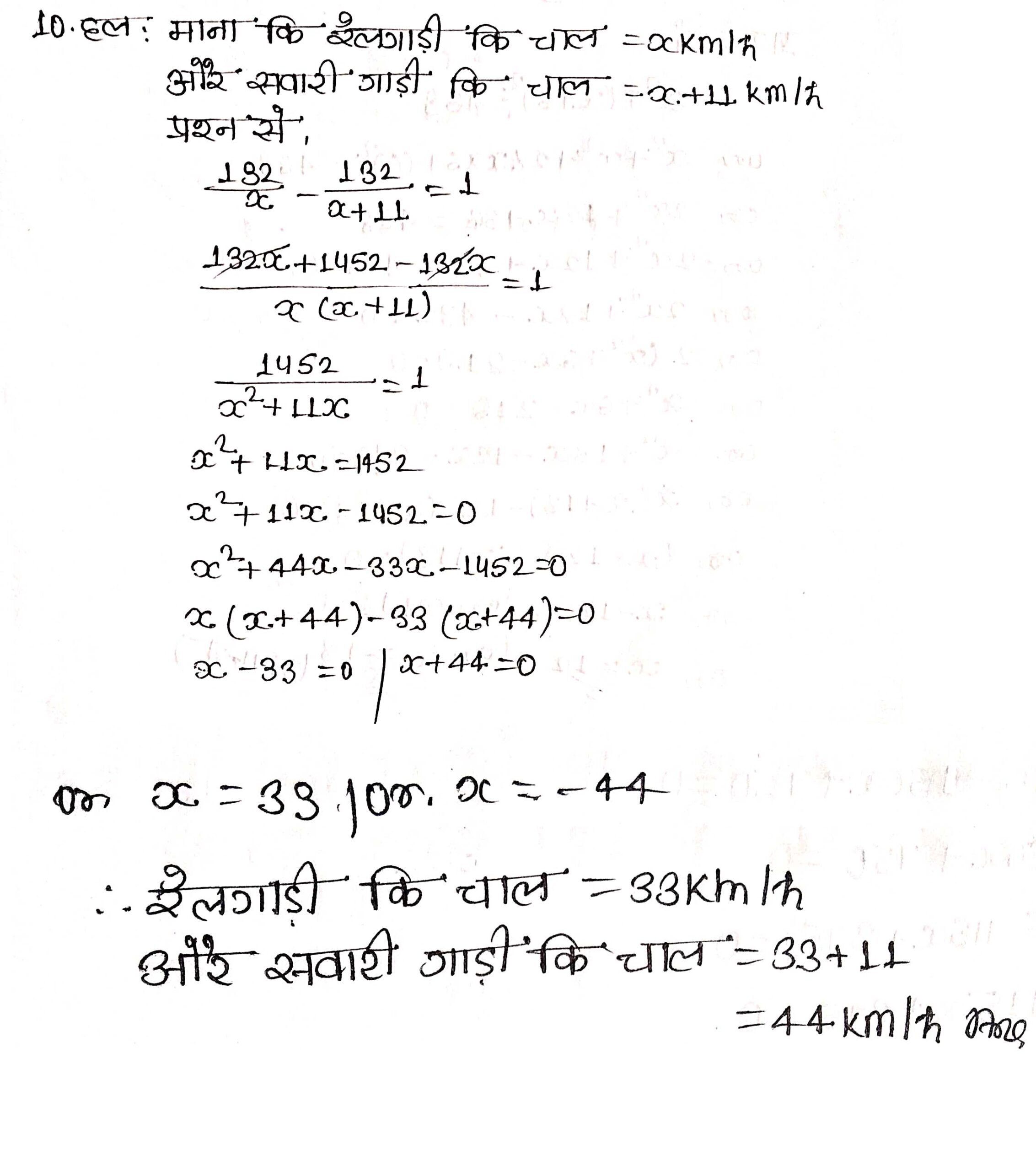 प्रश्न 10. मैसूर और बैंगलौर के बीच के 132 km यात्रा करने में एक एक्सप्रेस रेलगाड़ी, सवारी गाड़ी से 1 घंटा समय कम लेती है (मध्य के स्टेशनों पर ठहरने का समय ध्यान में न लिया जाए)। यदि एक्सप्रेस रेलगाड़ी की औसत चाल, सवारी गाड़ी की औसत चाल से 11 km/h अधिक हो, तो दोनों रेलगाड़ियों की औसत चाल ज्ञात कीजिए।