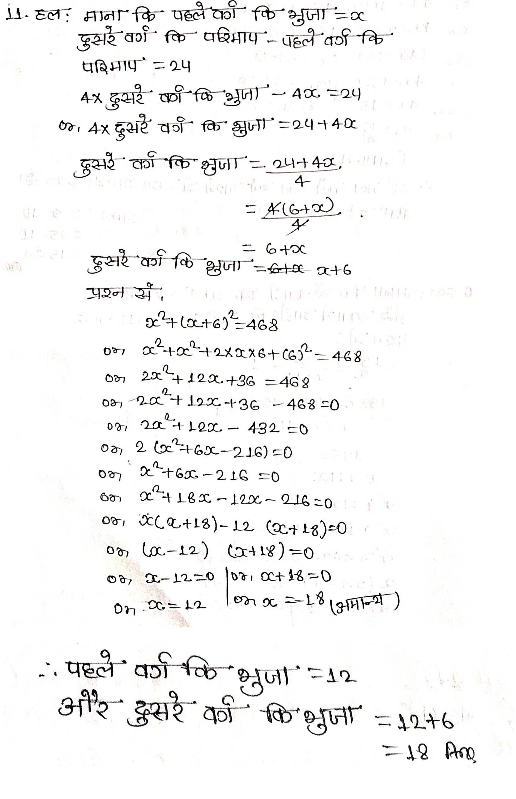 प्रश्न 11. दो वर्गों के क्षेत्रफलों का योग 468 m2 है। यदि उनके परिमापों का अन्तर 24 m हो, तो दोनों वर्गों की भुजाएँ ज्ञात कीजिए।