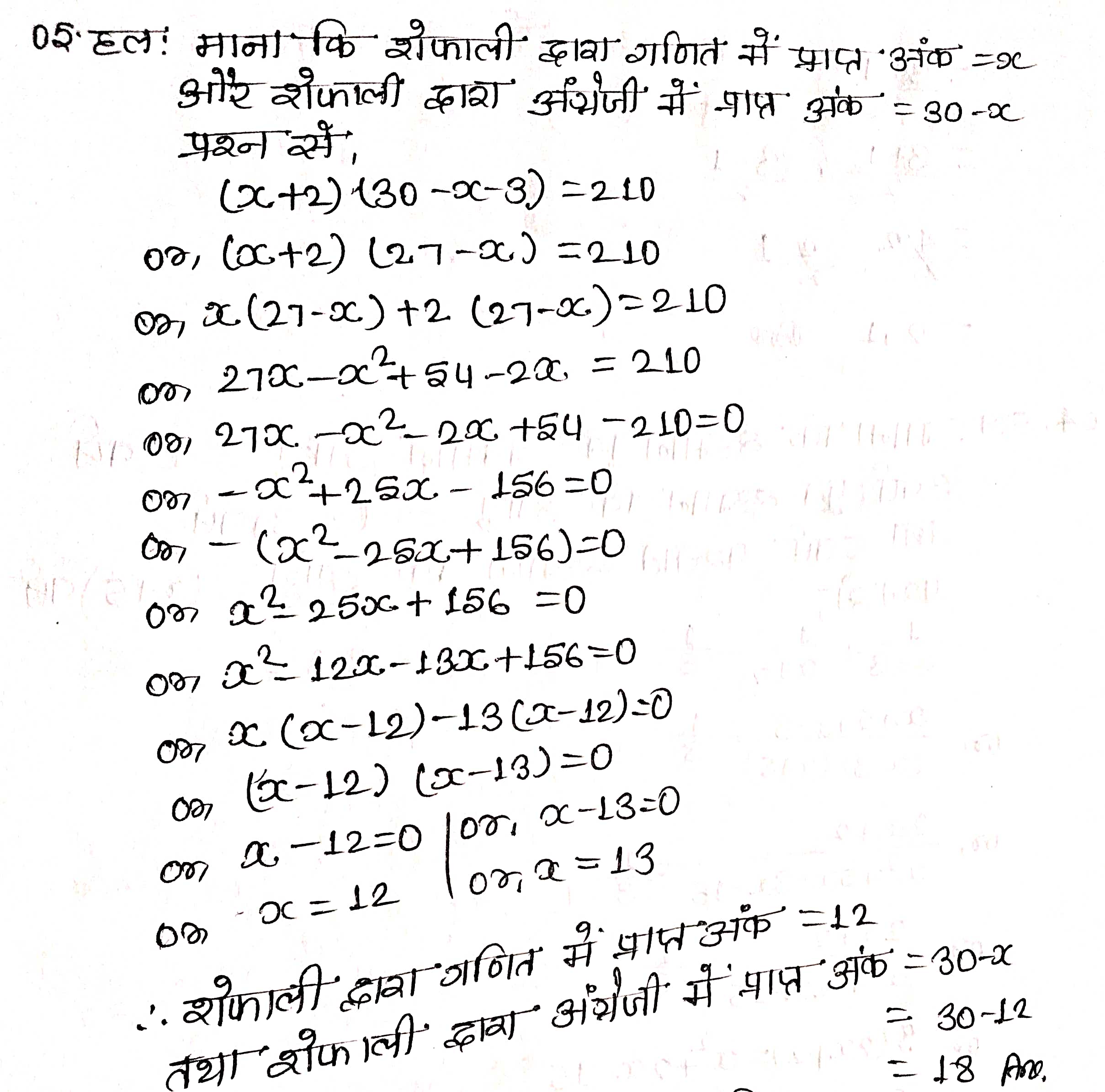 प्रश्न 5. एक क्लास टेस्ट में शेफाली के गणित और अंग्रेजी में प्राप्त किए गए अंकों का योग 30 है। यदि उसको गणित में 2 अंक अधिक और अंग्रेजी में 3 अंक कम मिले होते, तो उनके अंकों का गुणनफल 210 होता। उसके द्वारा दोनों विषयों में प्राप्त किए अंक ज्ञात कीजिए।
