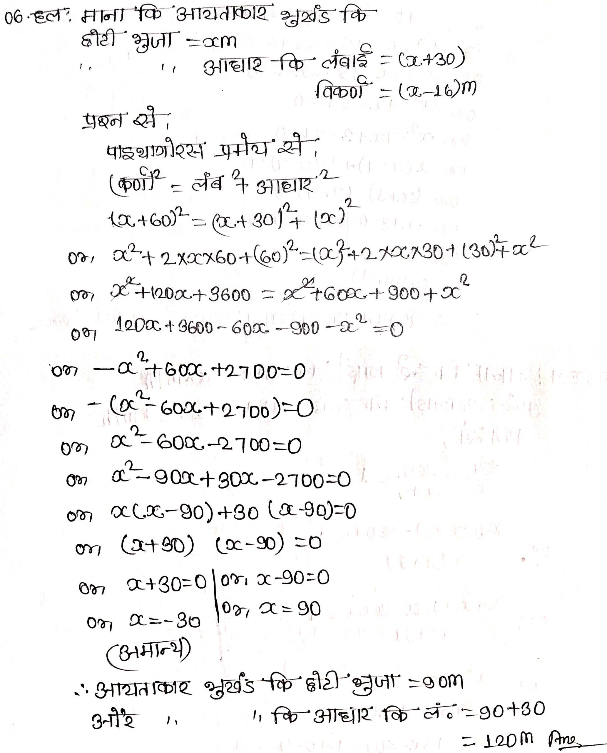 प्रश्न 6. एक आयताकार खेत का विकर्ण उसकी छोटी भुजा से 60 मी अधिक लम्बा है। यदि बड़ी भुजा छोटी भुजा से 30 मी अधिक हो, तो खेत की भुजाएँ ज्ञात कीजिए।