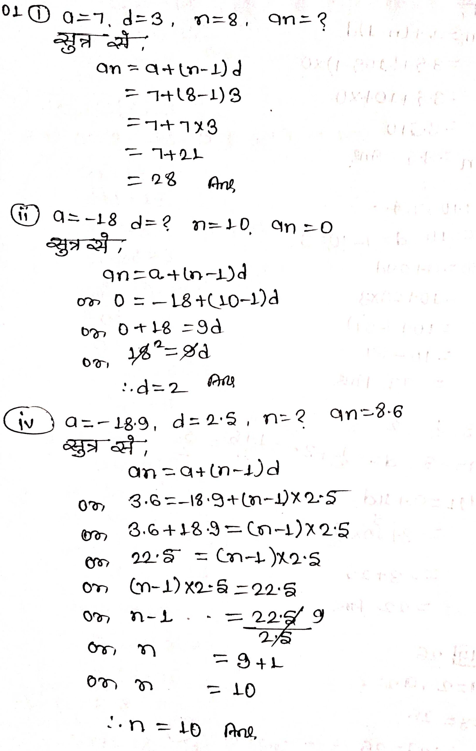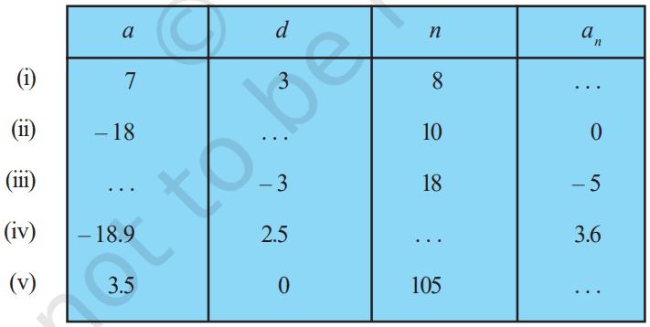 प्रश्न 1. निम्नलिखित सारणी में, रिक्त स्थानों को भरिए, जहाँ A.P. का प्रथम पद a, सार्वान्तर d और n वाँ पद an है: