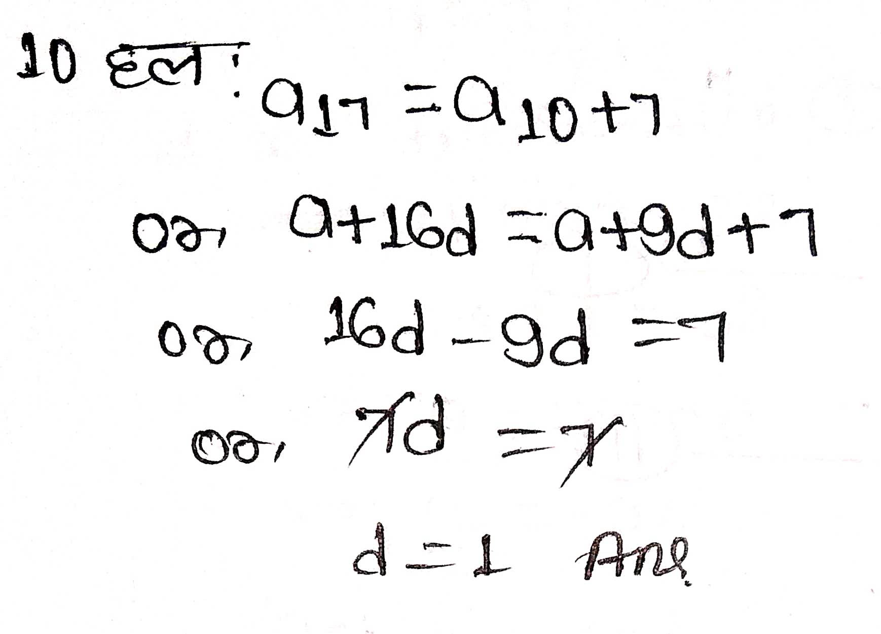 प्रश्न 10. किसी A.P. का 17 वाँ पद उसके 10 वें पद से 7 अधिक है। इसका सार्वान्तर ज्ञात कीजिए।