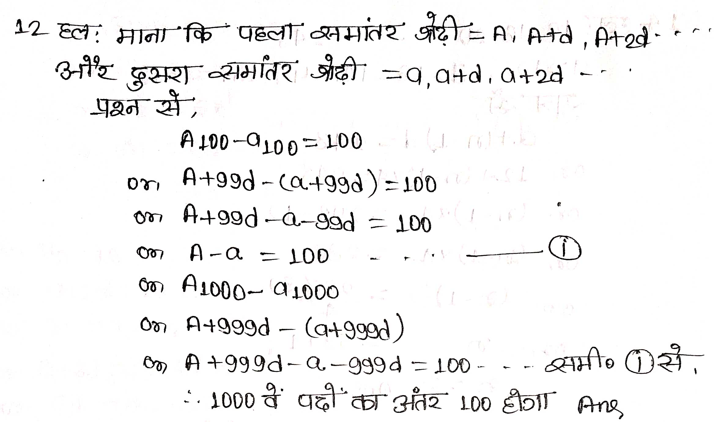 प्रश्न 12. दो समान्तर श्रेढ़ियों का सार्वान्तर समान है। यदि इनके 100 वें पदों का अन्तर 100 है, तो इनके 1000 वें पदों का अन्तर क्या होगा?