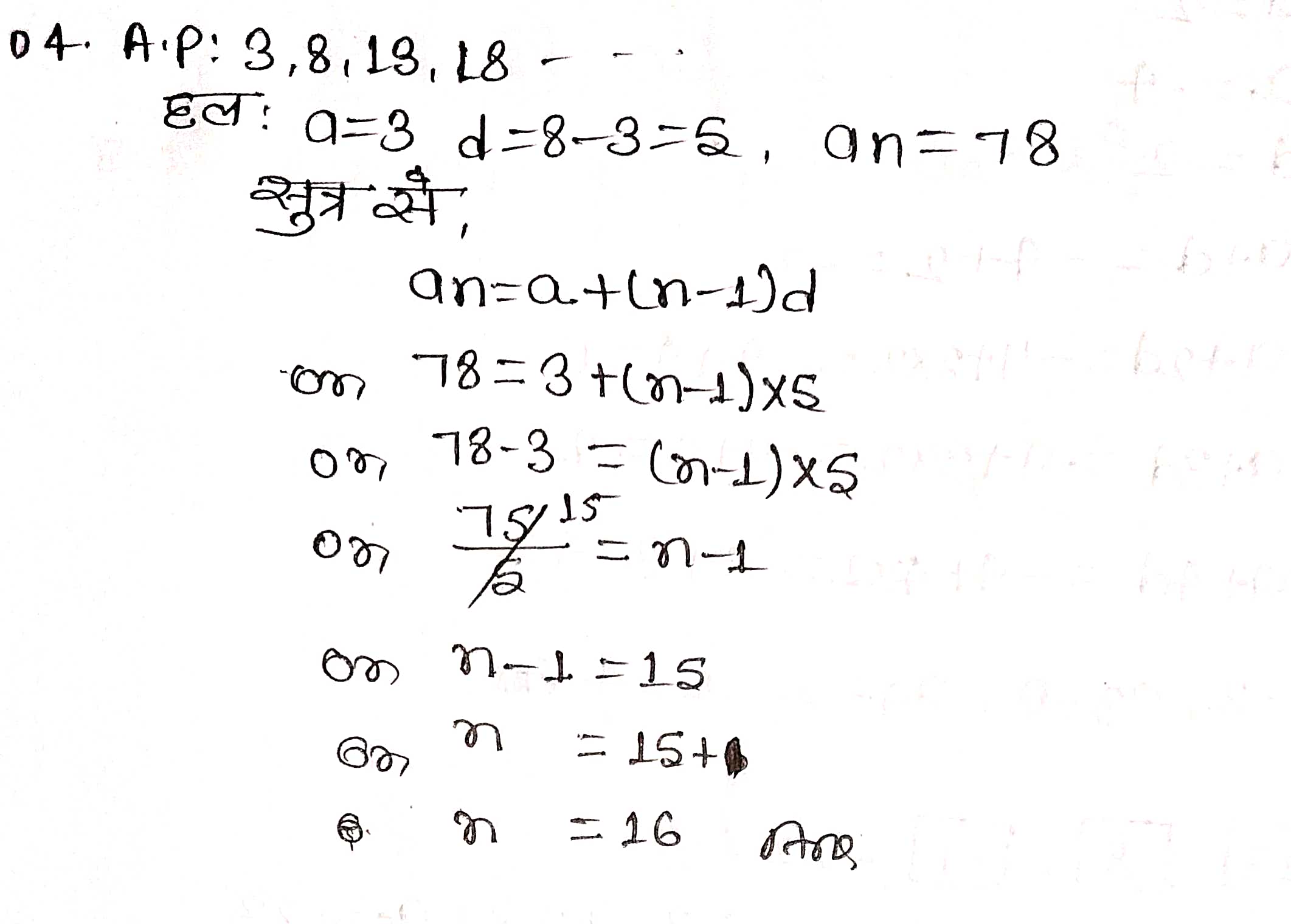 प्रश्न 4. A.P.: 3, 8, 13, 18, …… का कौन-सा पद 78 है?