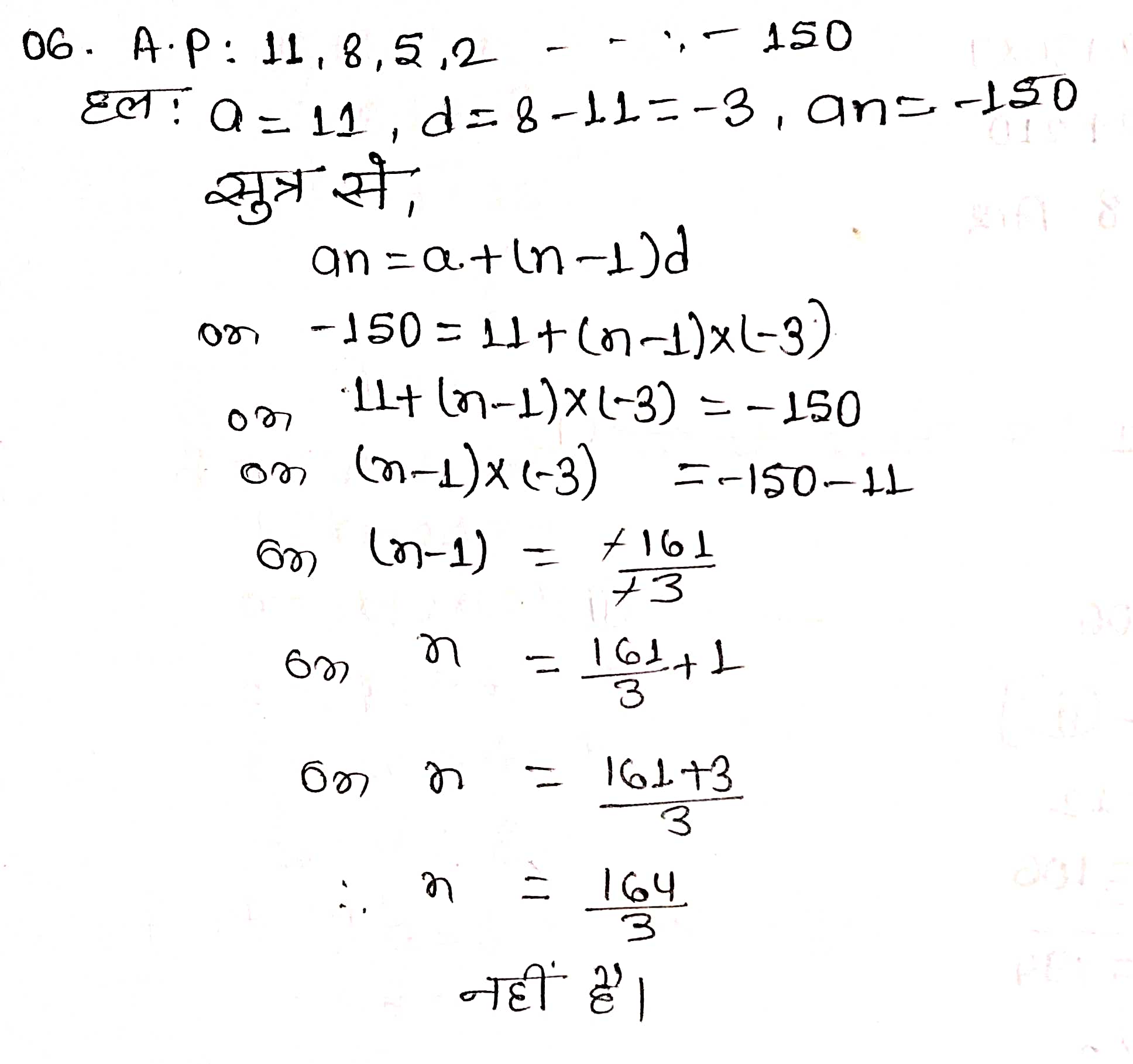 प्रश्न 6. क्या A.P. : 11, 8, 5, 2 का एक पद -150 है? क्यों?