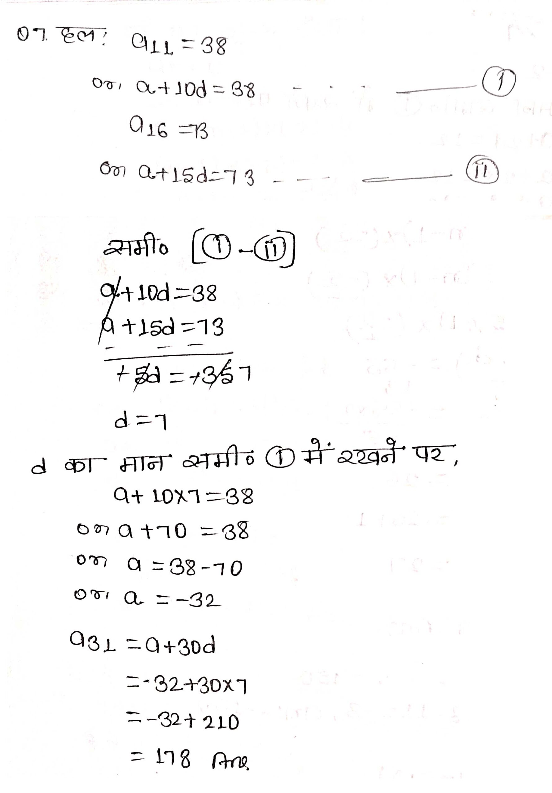 प्रश्न 7. उस A.P. का 31 वाँ पद ज्ञात कीजिए, जिसका 11 वाँ पद 38 है और 16 वाँ पद 73 है।