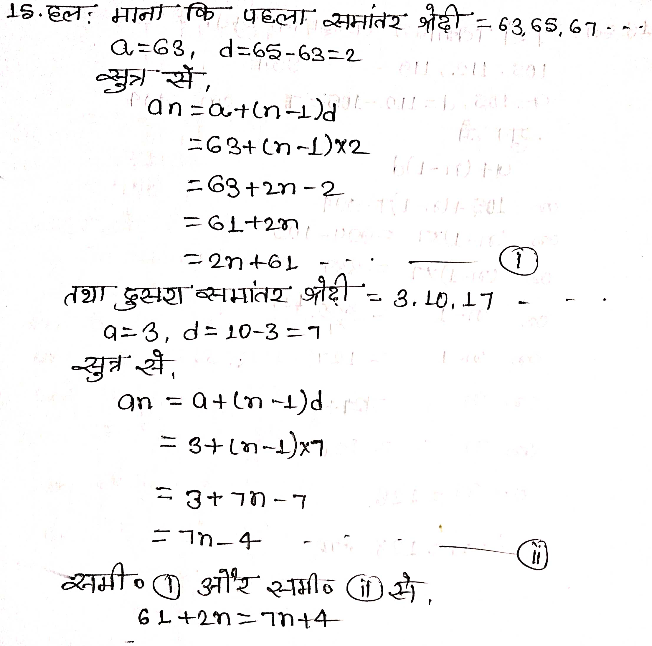 प्रश्न 15. n के किस मान के लिए, दोनों समान्तर श्रेढ़ियों 63, 65, 67, ….. और 3, 10, 17,…..के n वें पद बराबर होंगे?