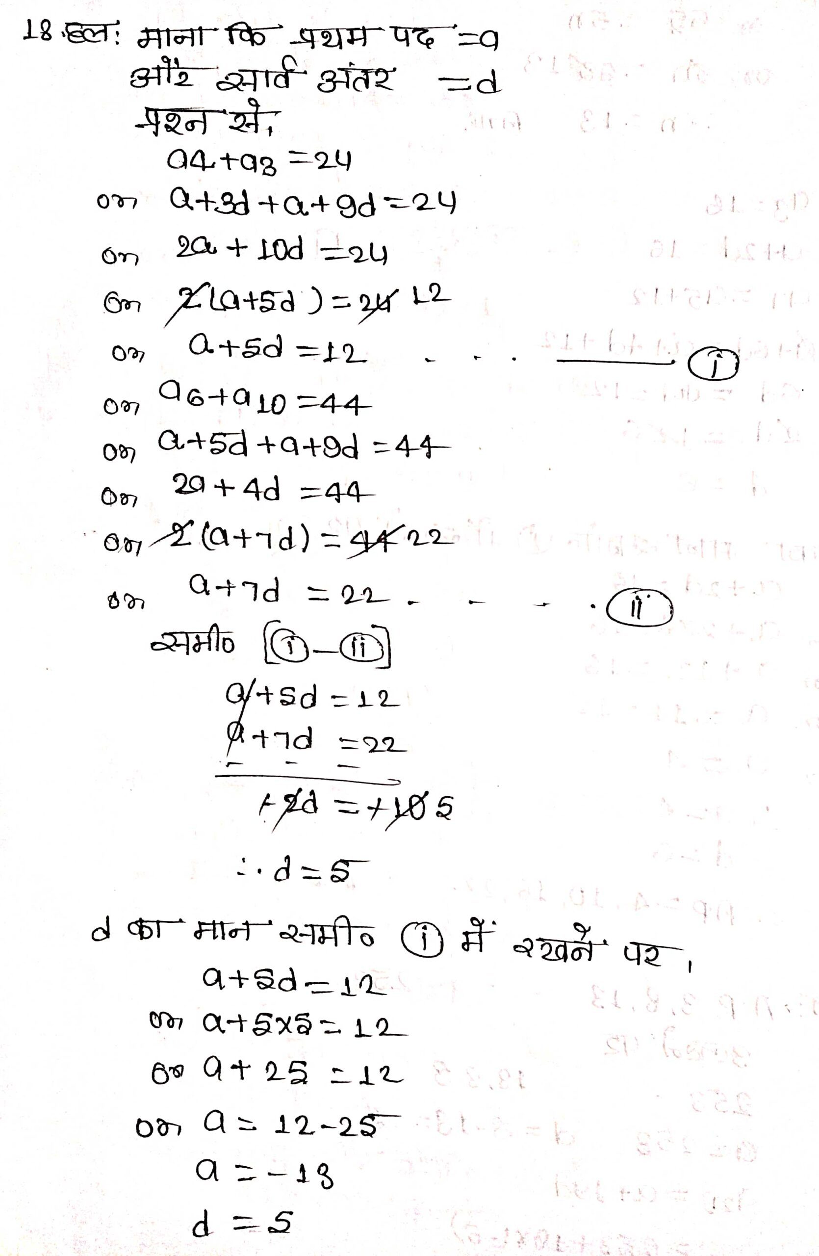 प्रश्न 18. किसी A.P. के चौथे और 8 वें पदों का योग 24 है तथा छठे और 10 वें पदों का योग 44 है। इस A.P. के प्रथम तीन पद ज्ञात कीजिए।