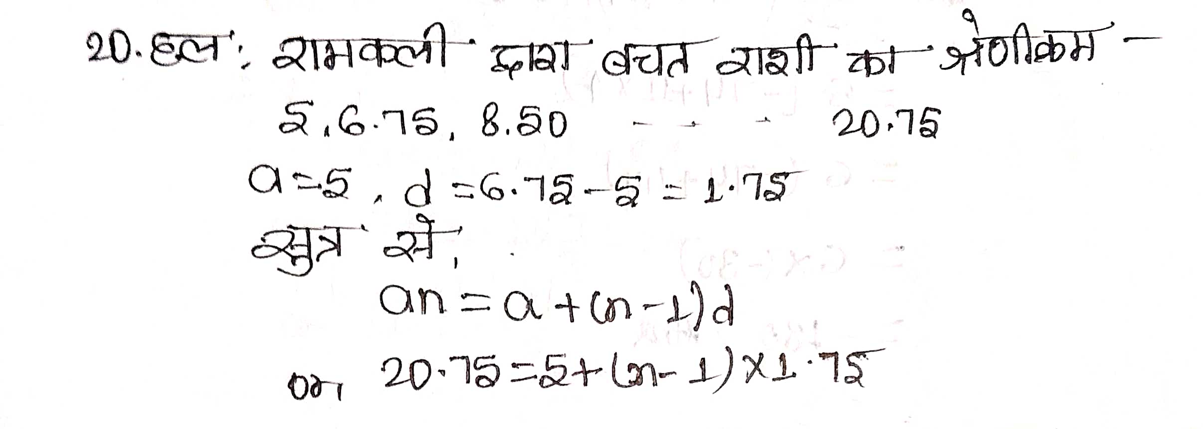 प्रश्न 20. रामकली ने किसी वर्ष के प्रथम सप्ताह में ₹ 5 की बचत की और फिर अपनी साप्ताहिक बचत ₹ 1.75 बढ़ाती गई। यदि n वें सप्ताह में उसकी साप्ताहिक बचत ₹ 20.75 हो जाती है, तो n ज्ञात कीजिए।