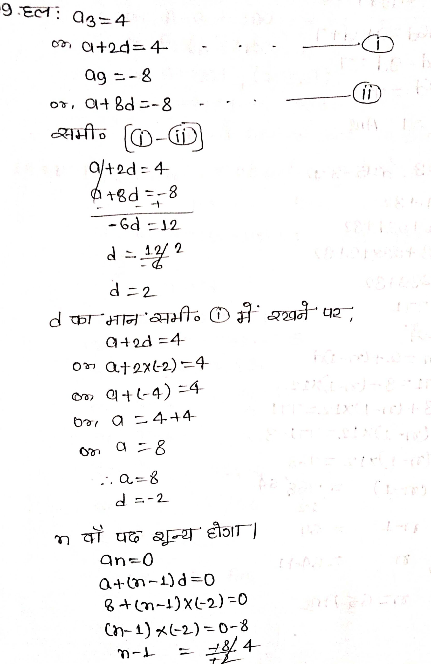 प्रश्न 9. यदि किसी A.P. के तीसरे और नौवें पद क्रमशः 4 और -8 हैं तो इसका कौन-सा पद शून्य होगा?
