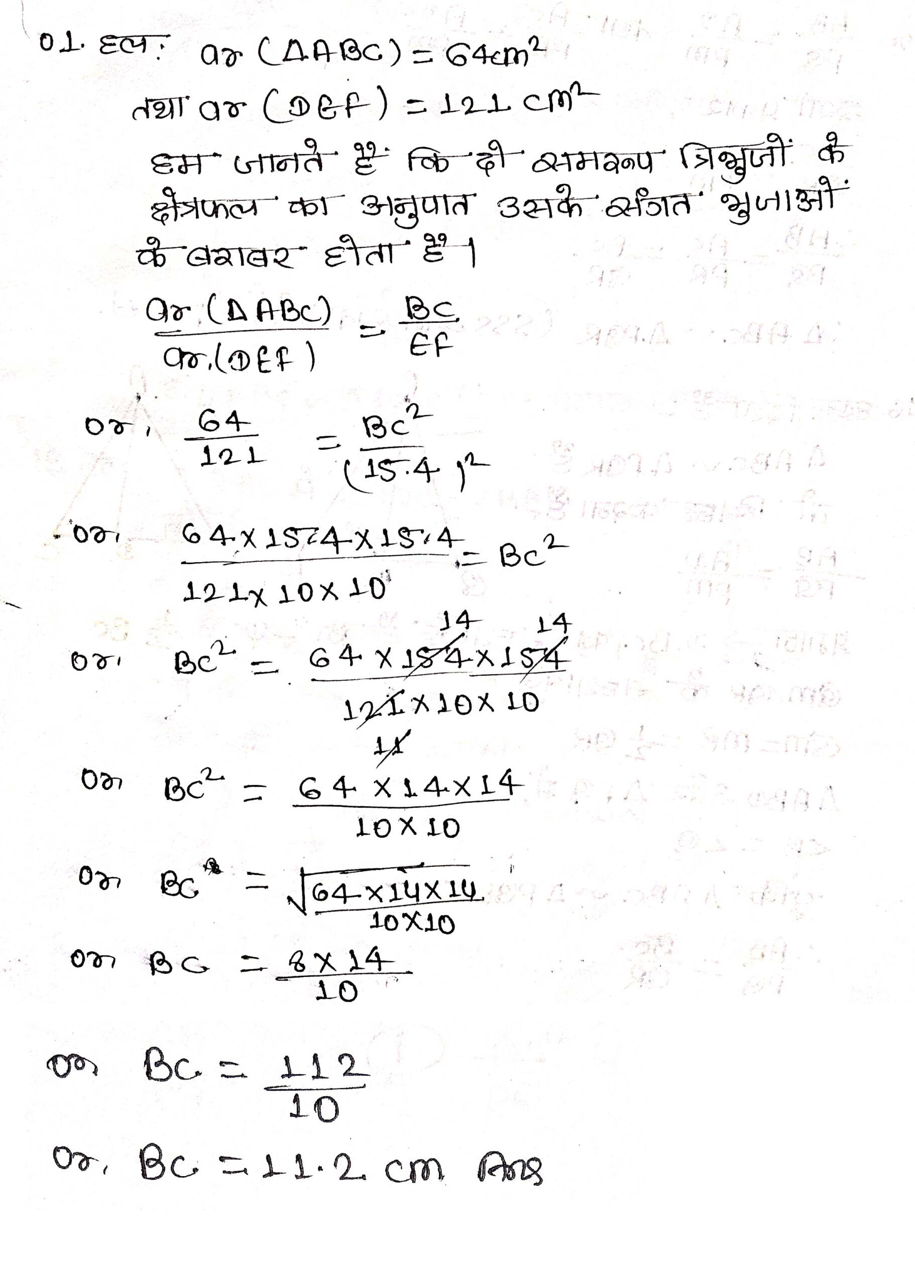 प्रश्न 1. मान लीजिए ΔABC ~ ΔDEF है और इनके क्षेत्रफल क्रमशः 64 cm2 और 121 cm2 हैं। यदि EF = 15.4 cm2 हो तो BC ज्ञात कीजिए।