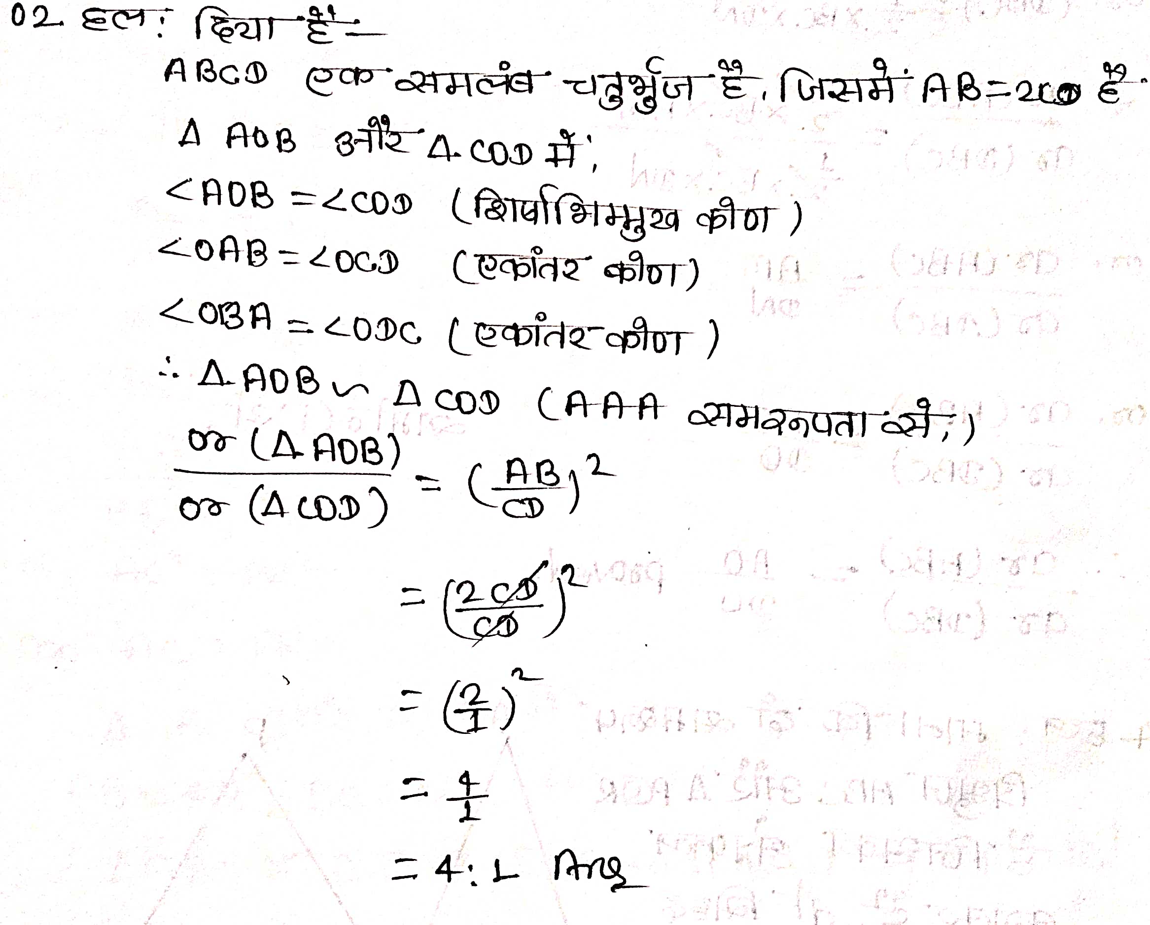 प्रश्न 2. एक समलम्ब ABCD जिसमें AB || CD है, के विकर्ण परस्पर बिन्दु O पर प्रतिच्छेद करते हैं। यदि AB = 2CD हो तो त्रिभुजों AOB और COD के क्षेत्रफलों का अनुपात ज्ञात कीजिए।