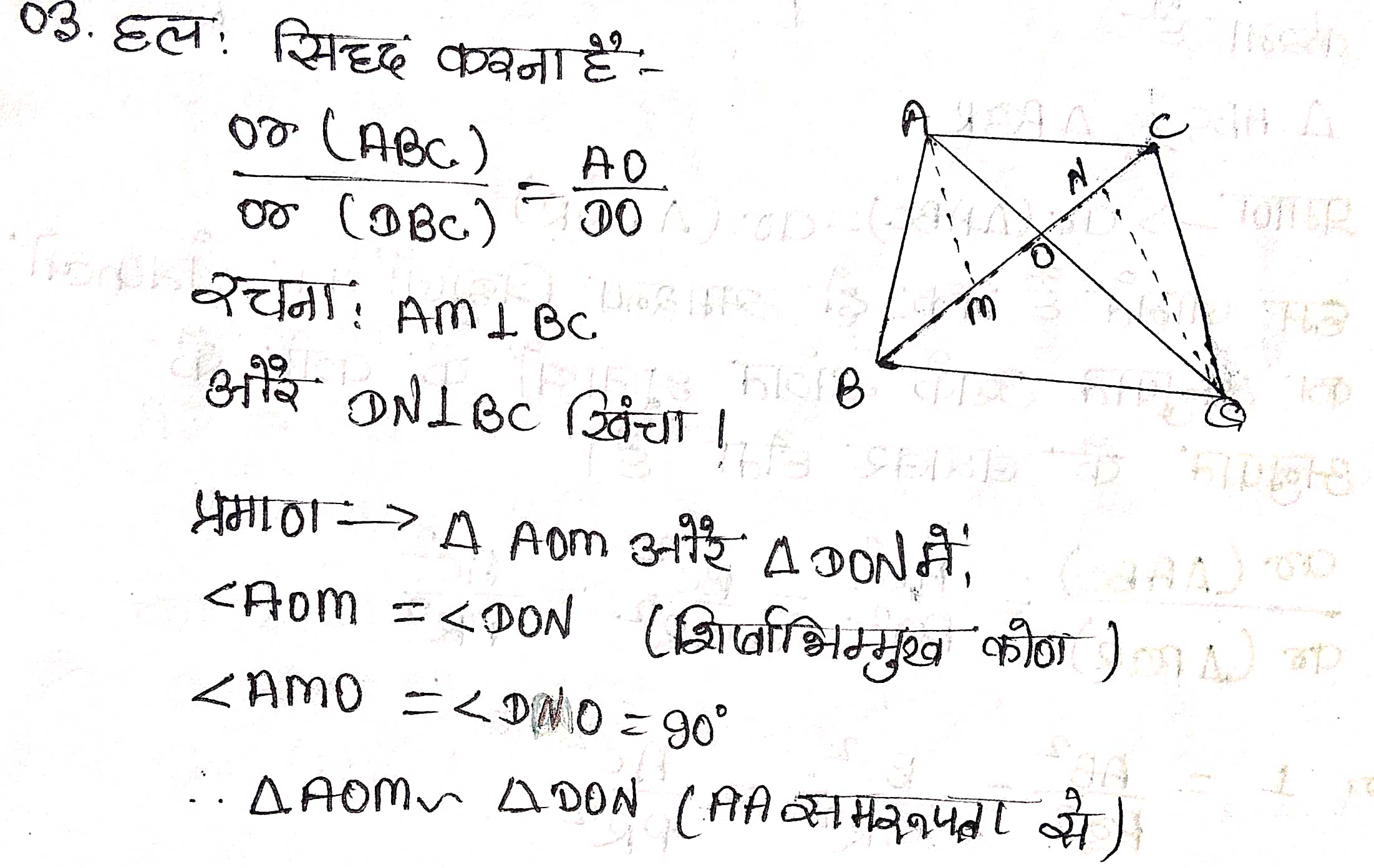 प्रश्न 3. दी गई आकृति में एक ही आधार BC पर दो त्रिभुज ABC और DBC बने हुए हैं। यदि AD, BC को O पर प्रतिच्छेद करे, तो दर्शाइए कि