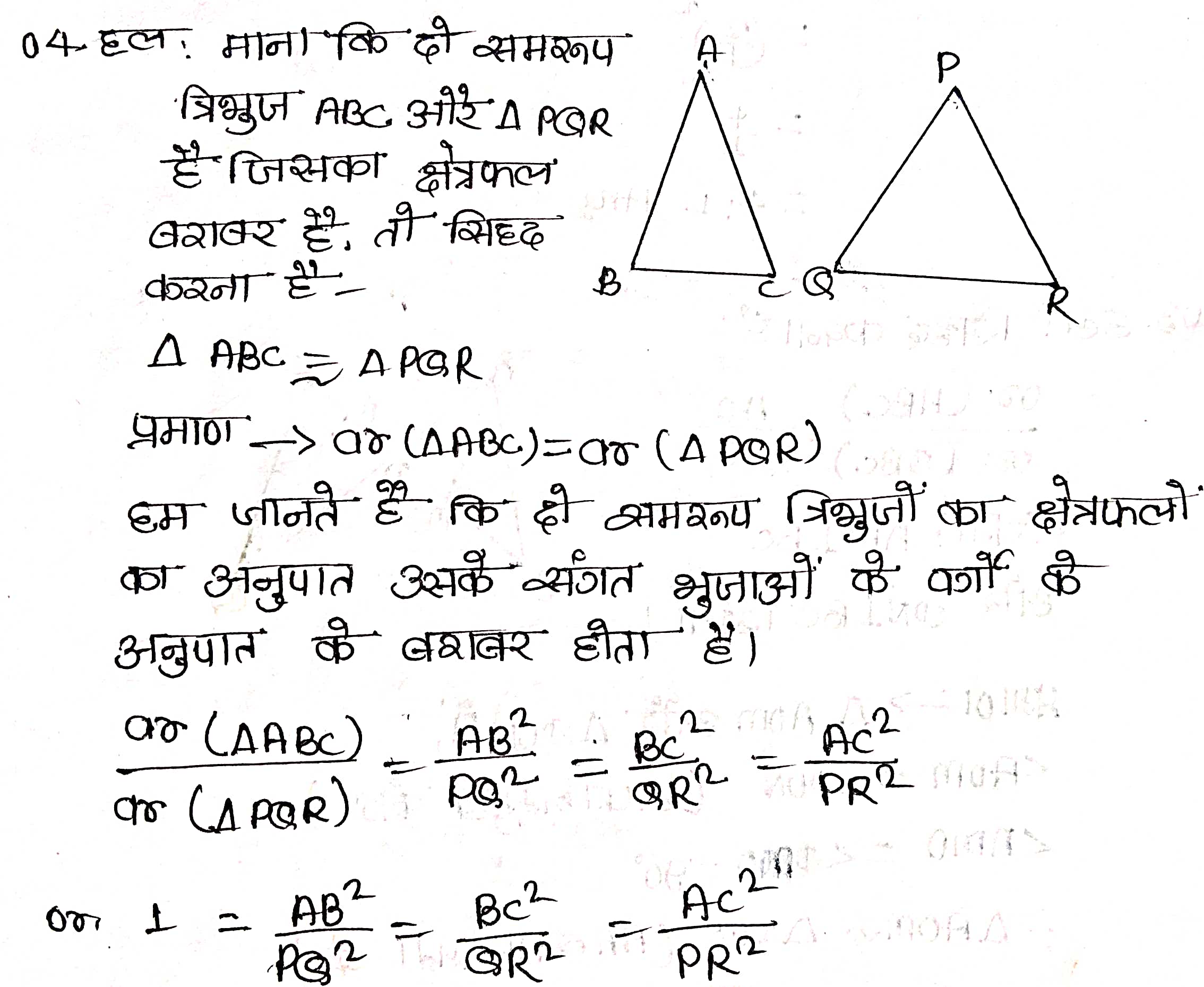 प्रश्न 4. यदि दो समरूप त्रिभुजों के क्षेत्रफल बराबर हों तो सिद्ध कीजिए कि वे सर्वांगसम होते हैं।