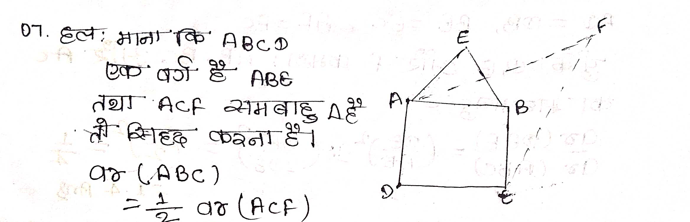 प्रश्न 7. सिद्ध कीजिए कि एक वर्ग की किसी भुजा पर बनाए गए समबाहु त्रिभुज का क्षेत्रफल उसी वर्ग के एक विकर्ण पर बनाए गए समबाहु त्रिभुज के क्षेत्रफल का आधा होता है।