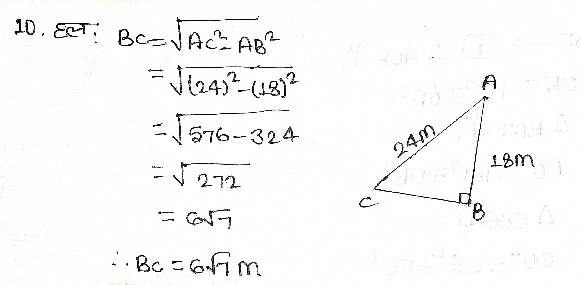 प्रश्न 10. 18 m ऊँचे एक ऊर्ध्वाधर खम्भे के ऊपरी सिरे से एक तार का एक सिरा जुड़ा हुआ है तथा तार का दूसरा सिरा एक खूटे से जुड़ा हुआ है। खम्भे के आधार से खुंटे को कितनी दूरी पर गाड़ा जाए कि तार तना रहे जबकि तार की लम्बाई 24 m है।