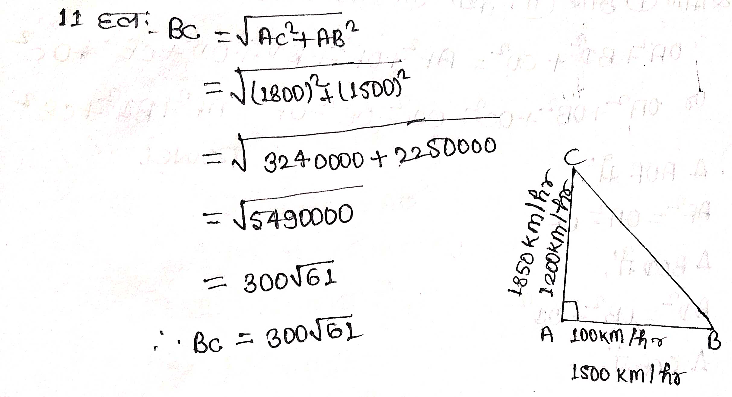 प्रश्न 11.एक हवाईजहाज एक हवाई अड्डे से उत्तर की ओर 1000 किमी प्रति घण्टा की चाल से उड़ता है। इसी समय एक अन्य हवाईजहाज उसी हवाई अड्डे से पश्चिम की ओर 1200 किमी प्रति घण्टा की चाल से उड़ता है। 112 घण्टे के बाद दोनों हवाईजहाजों के बीच की दूरी कितनी होगी?