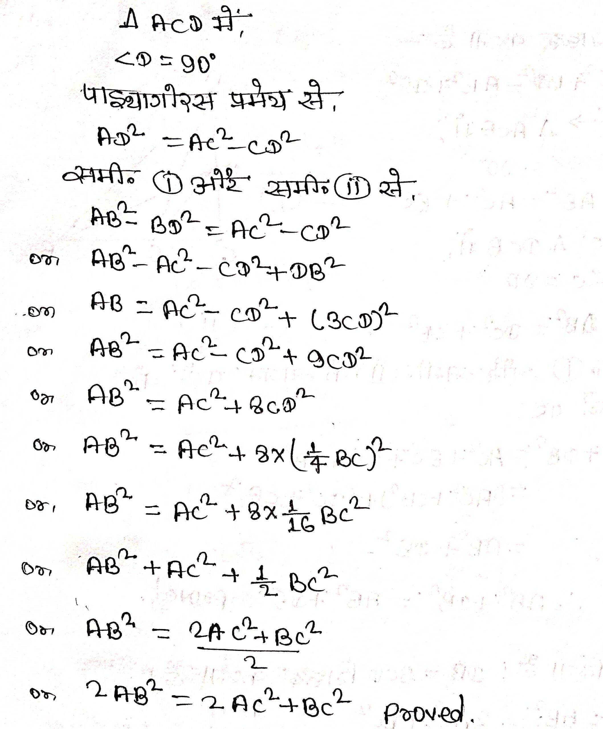 प्रश्न 14. किसी ∆ABC के शीर्ष A से भुजा BC पर डाला गया लम्ब BC को बिन्दु D पर इस प्रकार प्रतिच्छेद करता है कि DB = 3CD है। सिद्ध कीजिए कि 2AB2 = 2AC2 + BC2 है।