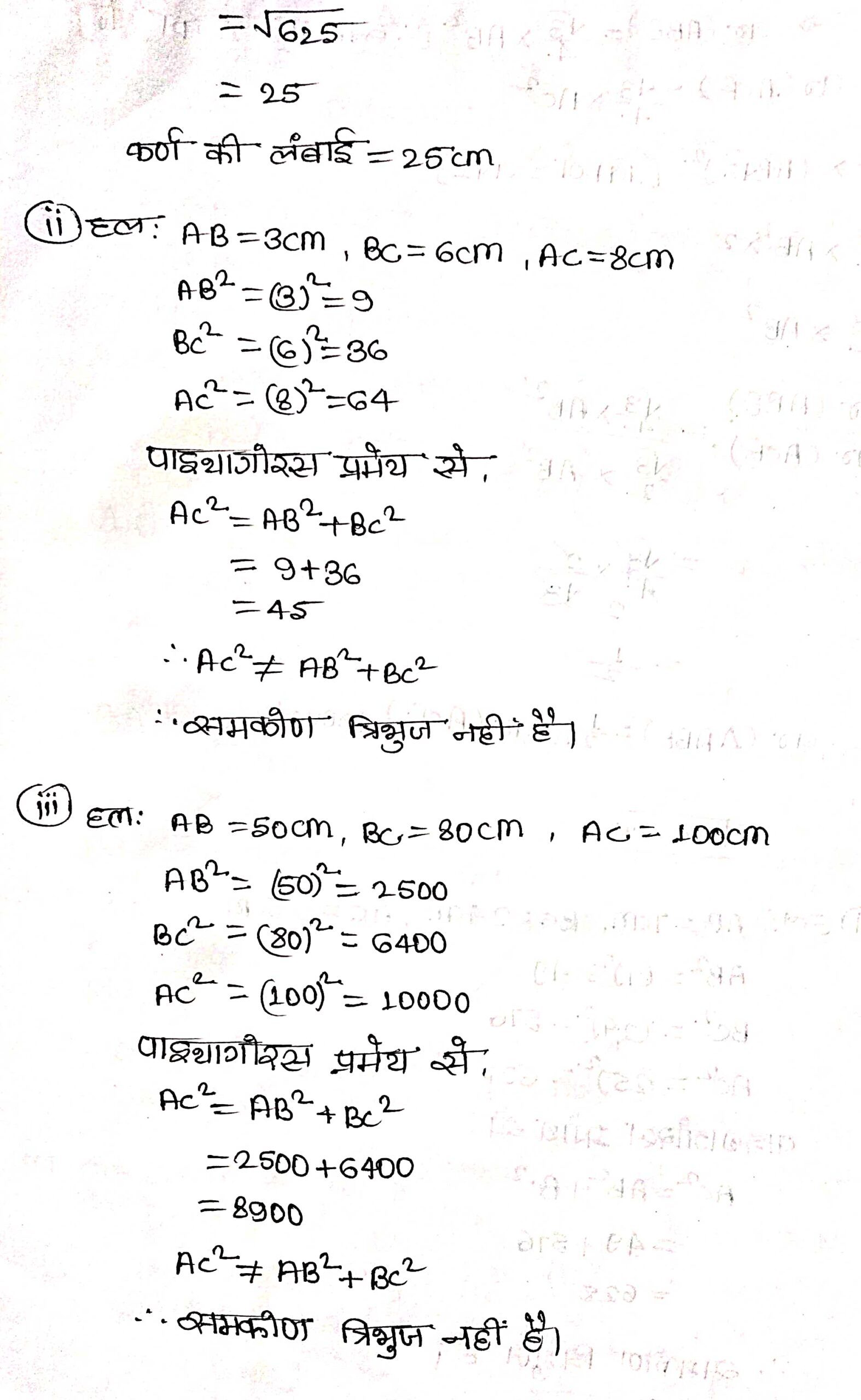 प्रश्न 1. कुछ त्रिभुजों की भुजाएँ नीचे दी गई हैं। निर्धारित कीजिए कि इनमें से कौन-कौन से समकोण त्रिभुज हैं। इस स्थिति में कर्ण की लम्बाई भी खिए।