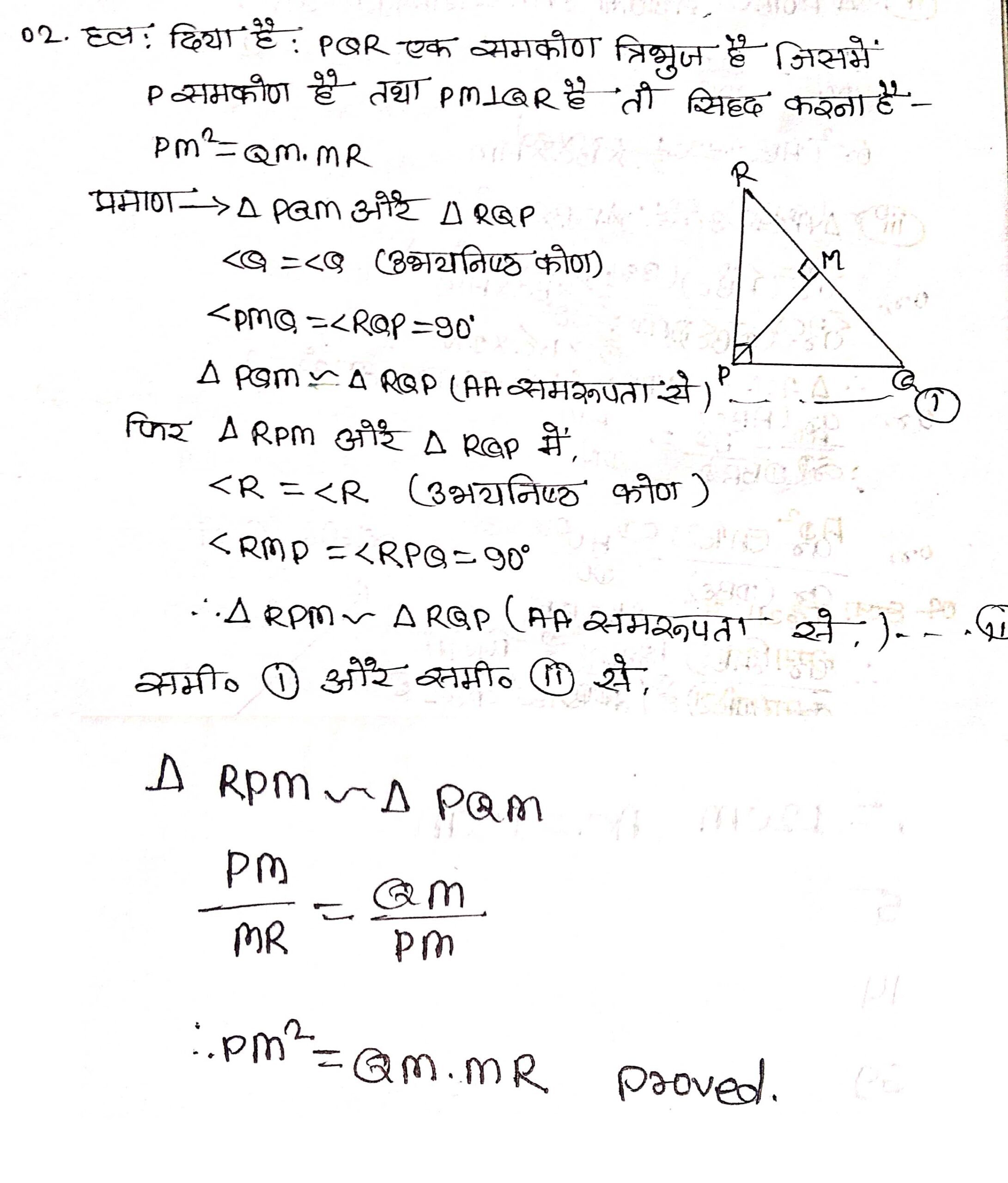 प्रश्न 2. PQR एक समकोण त्रिभुज है जिसका कोण Pसमकोण है तथा QR पर बिन्दु M इस प्रकार स्थित है कि PM ⊥ QR है। दर्शाइए कि PM2 = QM . MR है।