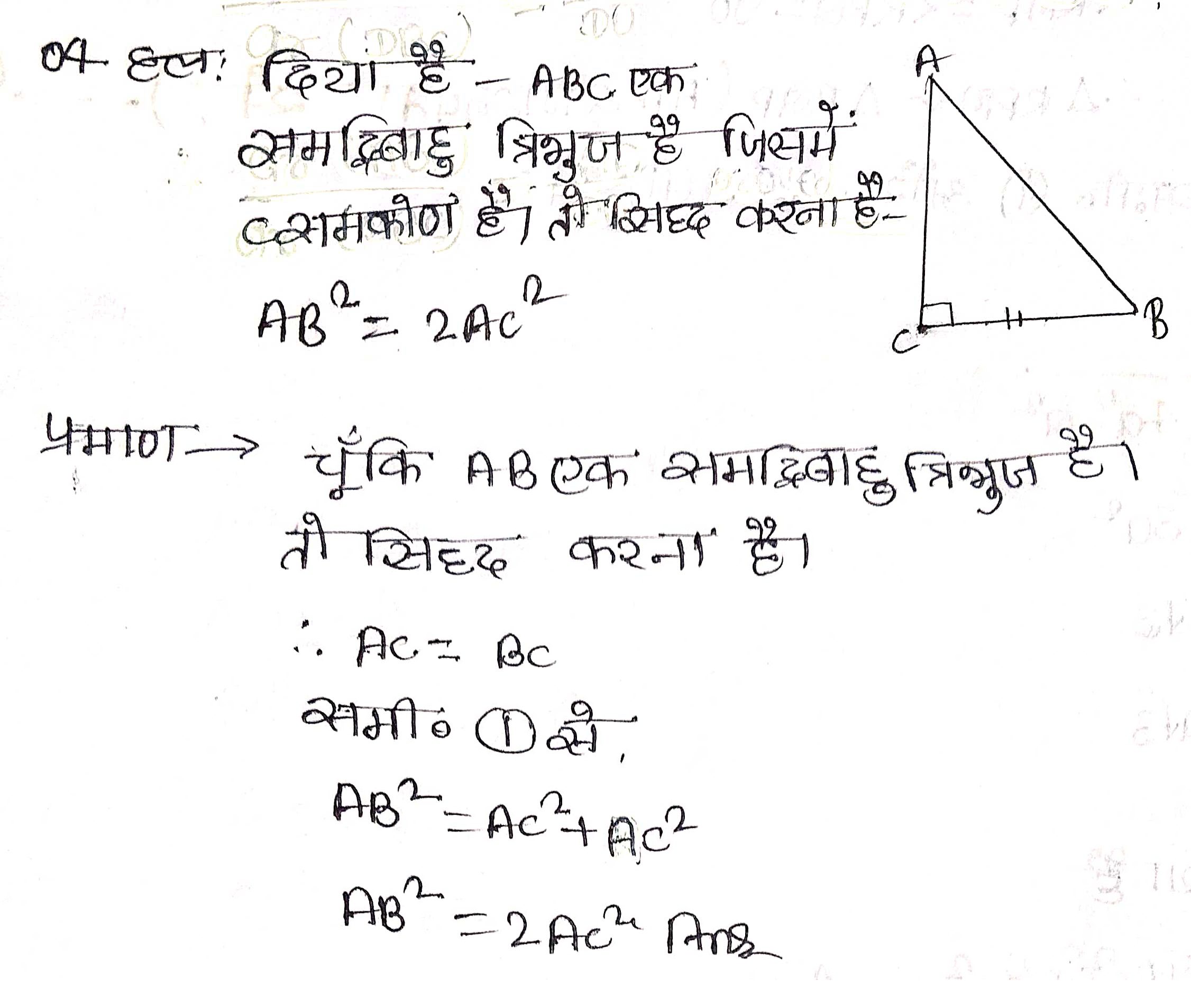 प्रश्न 4. ABC एक समद्विबाहु त्रिभुज है जिसका कोण C समकोण है। सिद्ध कीजिए कि AB2 = 2AC2 है।