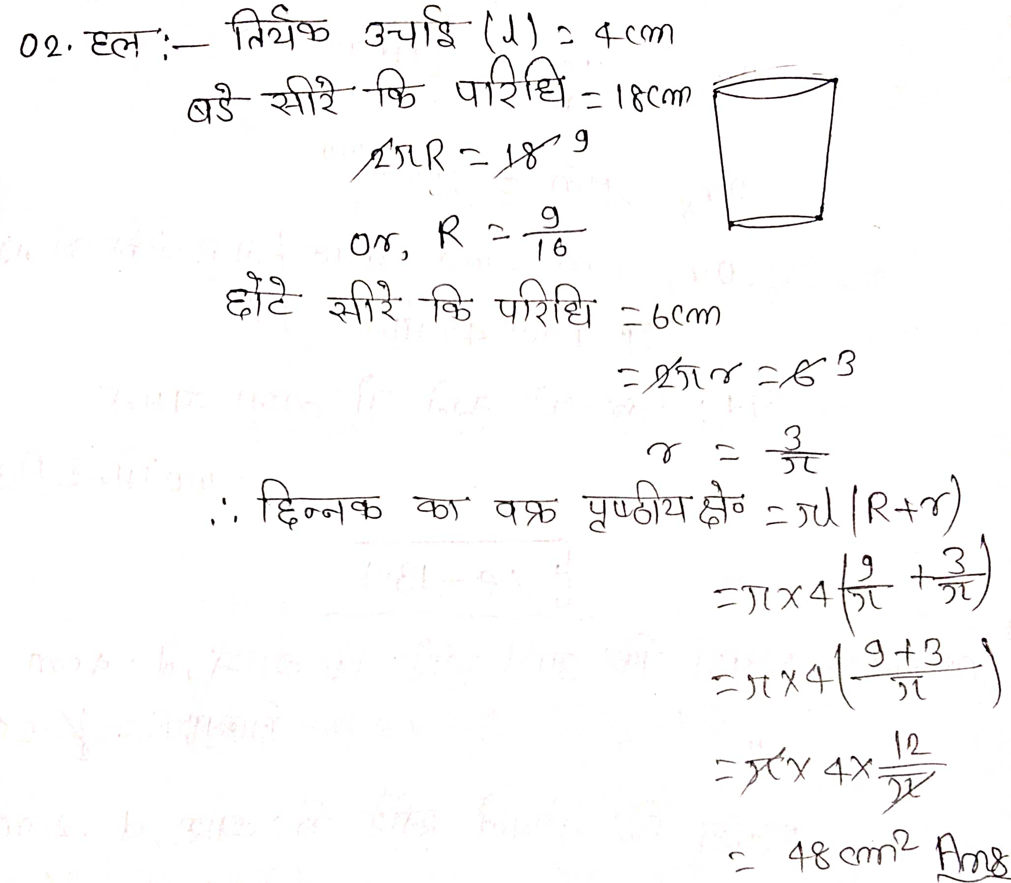 प्रश्न 2. एक शंकु के छिन्नक की तिर्यक ऊँचाई 4 cm है तथा इसके वृत्तीय सिरों के परिमाप (परिधियाँ) 18 cm और 6 cm हैं। इस छिन्नक का व्रक पृष्ठीय क्षेत्रफल ज्ञात कीजिए।