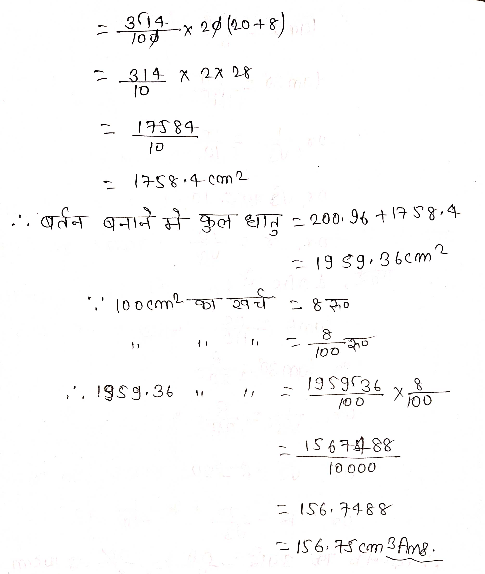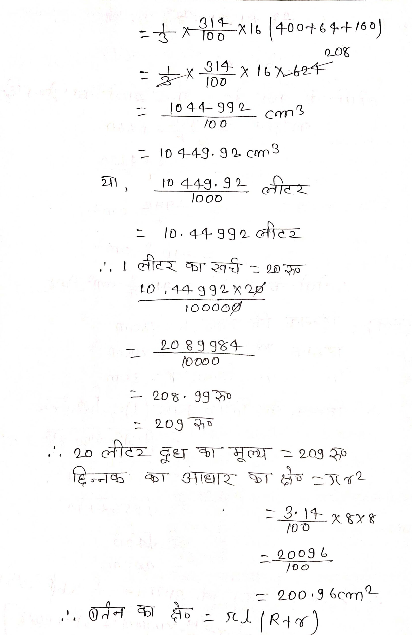 प्रश्न 4. धातु की चादर से बना और ऊपर से खुला एक बर्तन शंकु के एक छिन्नक के आकार का है, जिसकी ऊँचाई 16 cm है तथा निचले और ऊपरी सिरों की त्रिज्याएँ क्रमश 8 cm और 20 cm हैं। ₹ 20 प्रति लीटर की दर से, इस बर्तन को पूरा भर सकने वाले दूध का मूल्य ज्ञात कीजिए। साथ ही, इस बर्तन को बनाने के लिए प्रयुक्त धातु की चादर का मूल्य ₹ 8 प्रति 100 cm2 की दर से ज्ञात कीजिए। (π = 3.14 लीजिए)