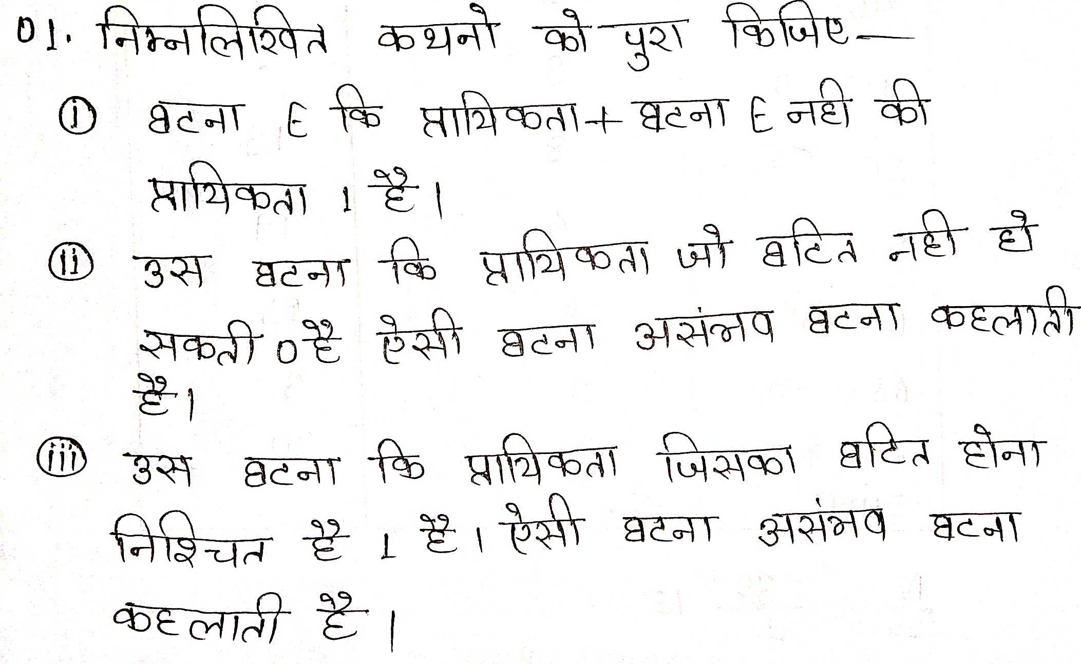 1. घटना E की प्रायिकता + घटना ‘E-नहीं’ की प्रायिकता = _________ है।
