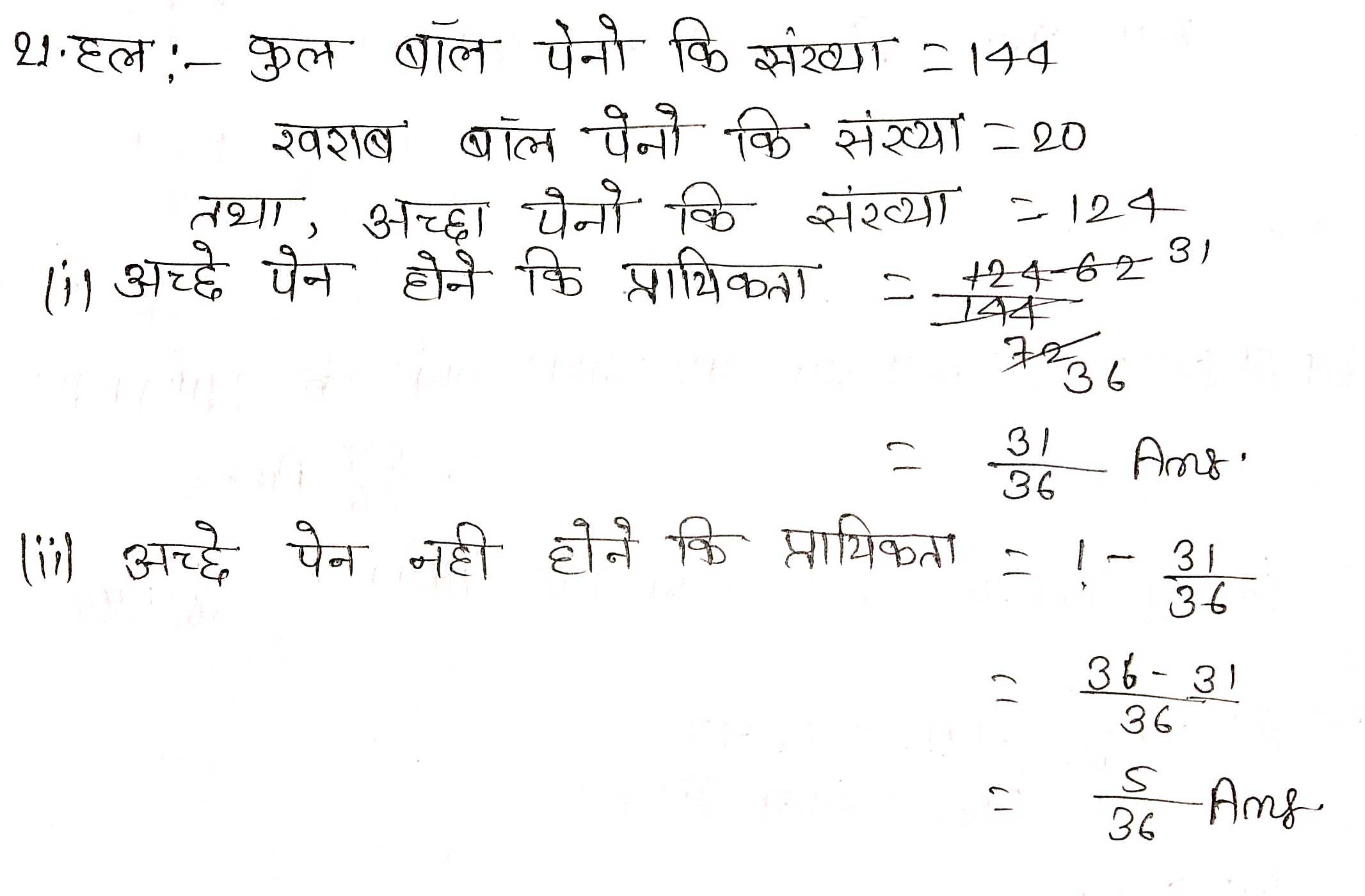 प्रश्न 21. 144 बॉल-पेनों के समूह में 20 बॉल-पेन खराब हैं और शेष अच्छे हैं। आप वही पेन खरीदना चाहेंगे जो अच्छा हो, परन्तु खराब पेन आप खरीदना नहीं चाहेंगे। दुकानदार इन पेनों में से, यदृच्छया एक पेन निकालकर आपको देता है। इसकी क्या प्रायिकता है कि