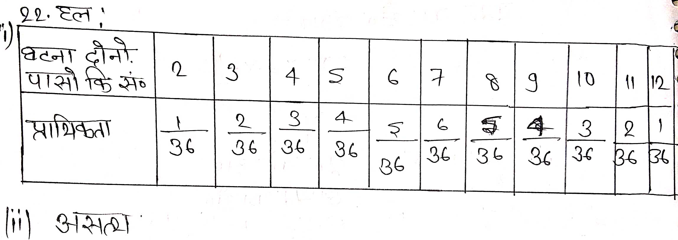 प्रश्न 22. एक सलेटी और एक नीले पासे को एक साथ फेंका जाता है। दोनों पासों पर प्राप्त होने वाले परिणाम अंकित कीजिए।