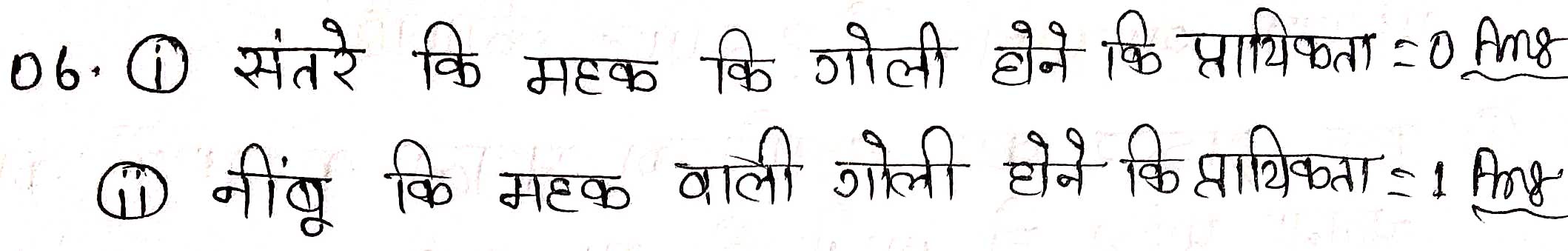 प्रश्न 6. एक थैले में केवल नीबू की महक वाली मीठी गोलियाँ हैं। मालिनी बिना थैले में झाँके उसमें से एक गोली निकालती है। इसकी क्या प्रायिकता है कि वह निकाली गई गोली