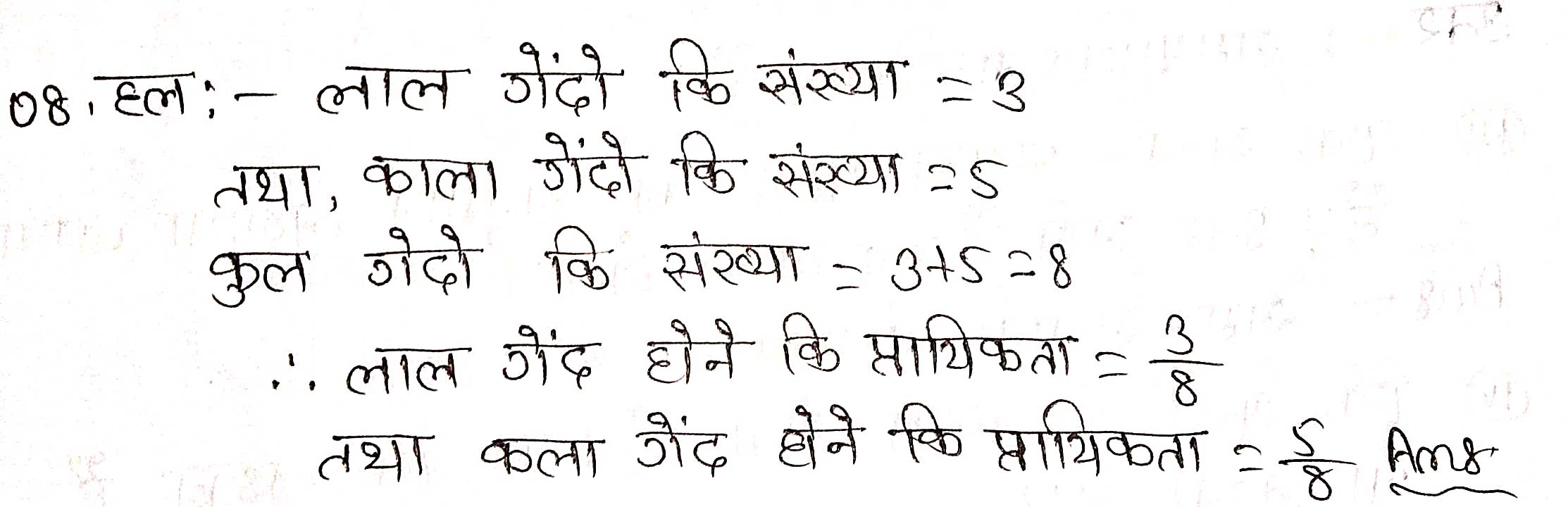 प्रश्न 8. एक थैले में 3 लाल और 5 काली गेंदें हैं। इस थैले में से एक गेंद यदृच्छया निकाली जाती है। इसकी प्रायिकता क्या है कि गेंद (i) लाल हो? (ii) लाल नहीं हो?