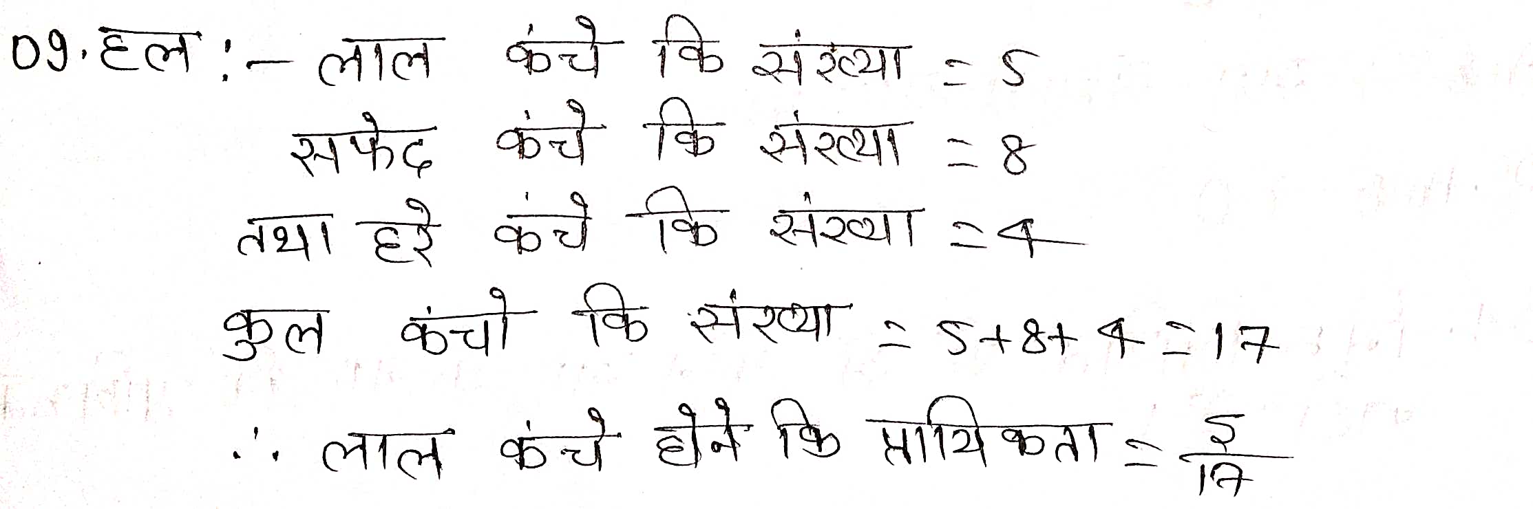 प्रश्न 9. एक डिब्बे में 5 लाल कंचे, 8 सफेद कंचे और 4 हरे कंचे हैं। इस डिब्बे में से एक कंचा यदृच्छया निकाला जाता है। इसकी क्या प्रायिकता है कि निकाला गया कंचा