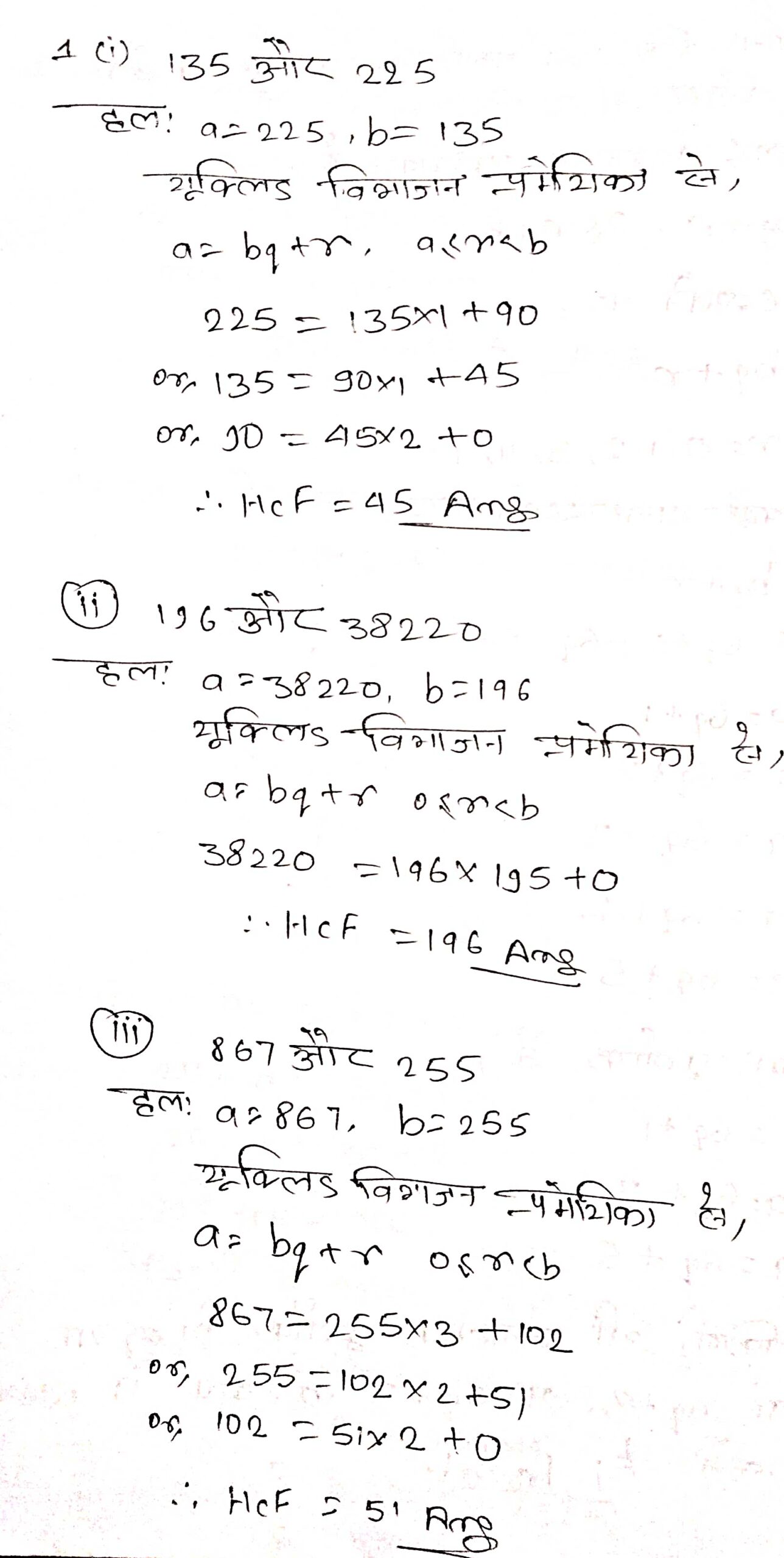 प्रश्न 1. निम्नलिखित संख्याओं का महत्तम समापवर्तक (H.C.F.) ज्ञात करने के लिए यूक्लिड विभाजन एल्गोरिथ्म का प्रयोग कीजिए :