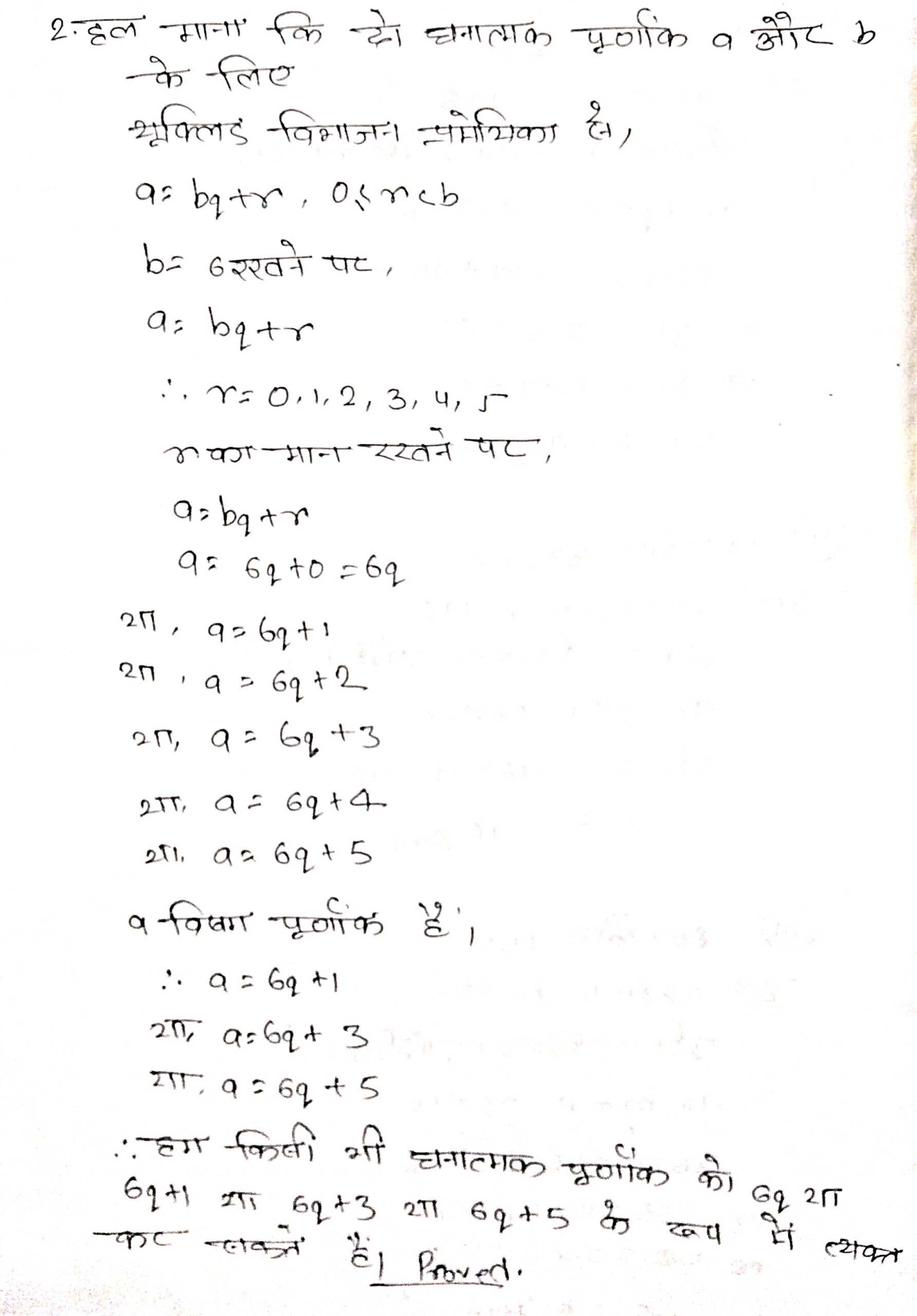 प्रश्न 2. दर्शाइए कि कोई भी धनात्मक विषम पूर्णांक 6q + 1 या 6q + 3 या 6q + 5 के रूप का होता है, जहाँ कोई पूर्णांक है।