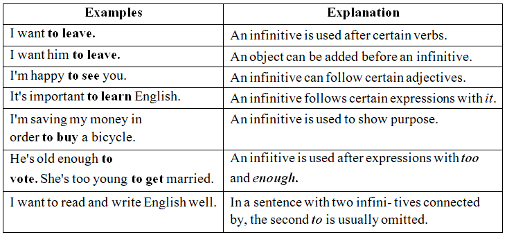 The underlined words are called infinitives. Find out some more sentences having infinitives. Now have more examples and explanations of infinitives in. the table below :