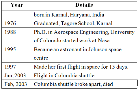 Q. Read the following table. It gives you some information about the famous astronaut Kalpana Chawala.