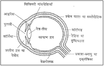 बनावट– मानव नेत्र या आँख लगभग गोलिय होता है। आँख के गोले कोनेत्रगोलक कहते हैं। नेत्रगोलक की सबसे बाहरी परत सफेद मोटे अपारदर्शी चमड़े की होती है, जिसे श्वेत पटल कहते हैं। श्वेत पटल का अगला कुछ उभरा हुआ भाग पारदर्शी होता है, जिसे कॉर्निया कहते हैं।