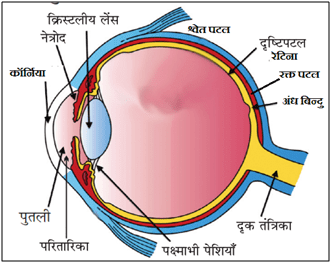 कार्य– नेत्र देखने का कार्य करती है। यह एक फोटो कैमरा की तरह कार्य करता है। बाहर से प्रकाश कॉर्निया से अपवर्तित होकर पुतली में होता हुआ लेंस पर पड़ता है। लेंस से अपवर्तन होने के बाद किरणें रेटिना पर पड़ती है और वहाँ वस्तु का प्रतिबिंब बनता है। इसके बाद मस्तिष्क में वस्तु को देखने की संवेदना उत्पन्न होती है।