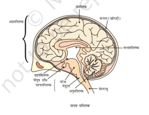 मनुष्य की मस्तिष्क- मस्तिष्क एक अत्यंत महŸवपूर्ण कोमल अंग है। तंत्रिका तंत्र के द्वारा शरीर की क्रियाओं के नियंत्रण और समन्वय में सबसे महत्वपूर्ण भूमिका इसी की होती है। मस्तिष्क क्रेनियम नामक हड्डी से सुरक्षित रहता है। इन हड्डीयों के अंदर मस्तिष्क मेनिंजीज झिल्ली से ढ़का होता है। मेनिंजीज और मस्तिष्क के बीच सेरीब्रोस्पाइनल द्रव्य भरा होता है।