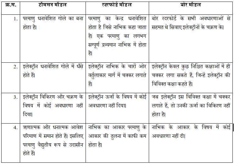 प्रश्न 18. इस अध्याय में दिए गए सभी परमाणु मॉडलों की तुलना कीजिए।